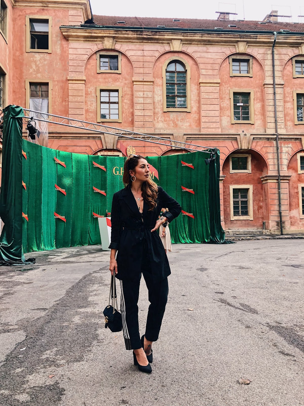Za moje vstupy na přehlídky děkuju Lindexu, od kterých jsem měla full service a i proto jsem jako jeden z těch dejme-tomu-výraznějších outfitů zvolila tyhle jejich pyžamový kalhoty, co jsem měla na minulým fashion weeku i se sladěným vrškem. Rozhodně jsem totiž neměla v plánu nakupovat nový věci na nový outfity ani si všechno někde půjčovat, nope.