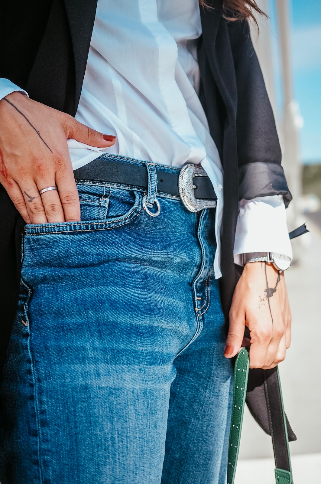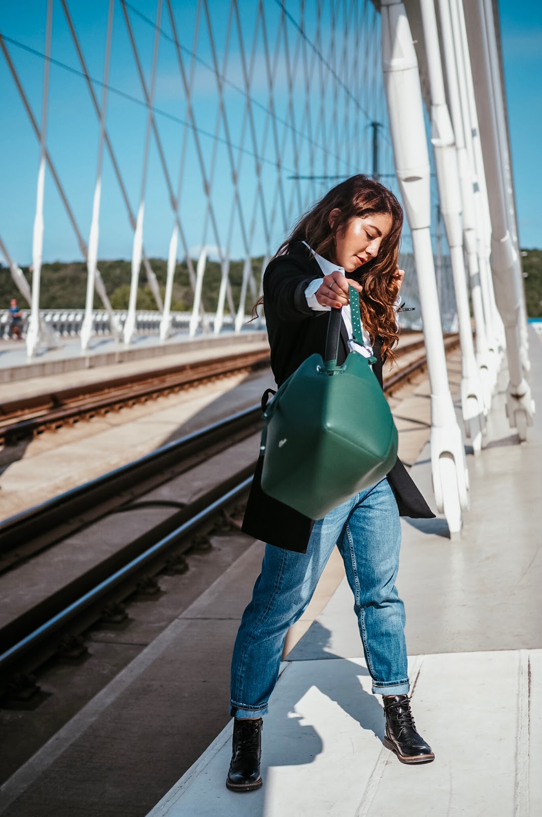 Oufit se mi líbí – já se ostatně v džínách cítím nejlíp (jen boty bych si vzala jiný) a kombinací černého saka a bílé košile se nic nezkazí, to je takové nadčasové. Jen kabelka mne neoslovila – nemám tyhle vaky ráda. Potřebuju mít v kabelce (tedy teď aktuálně v batůžku) spoustu kapsiček, ve kterých mají pravidelně nošené věci své místo a já nebloudím – karta do práce je v té úplně přední, brýle v té další, mobil ve vnitřní kapsičce….
