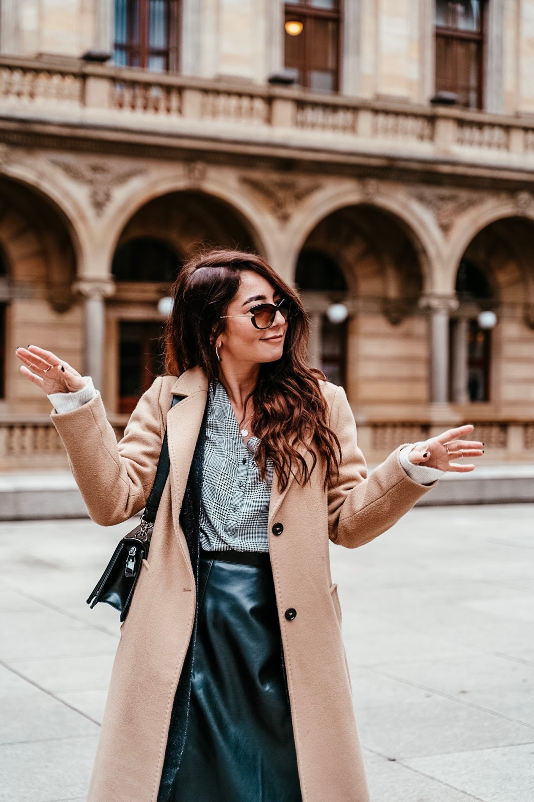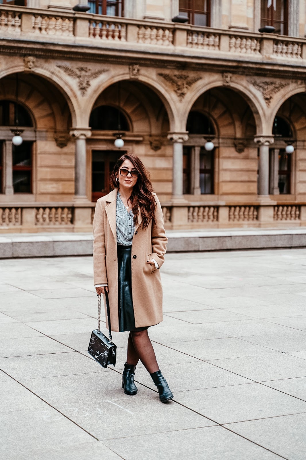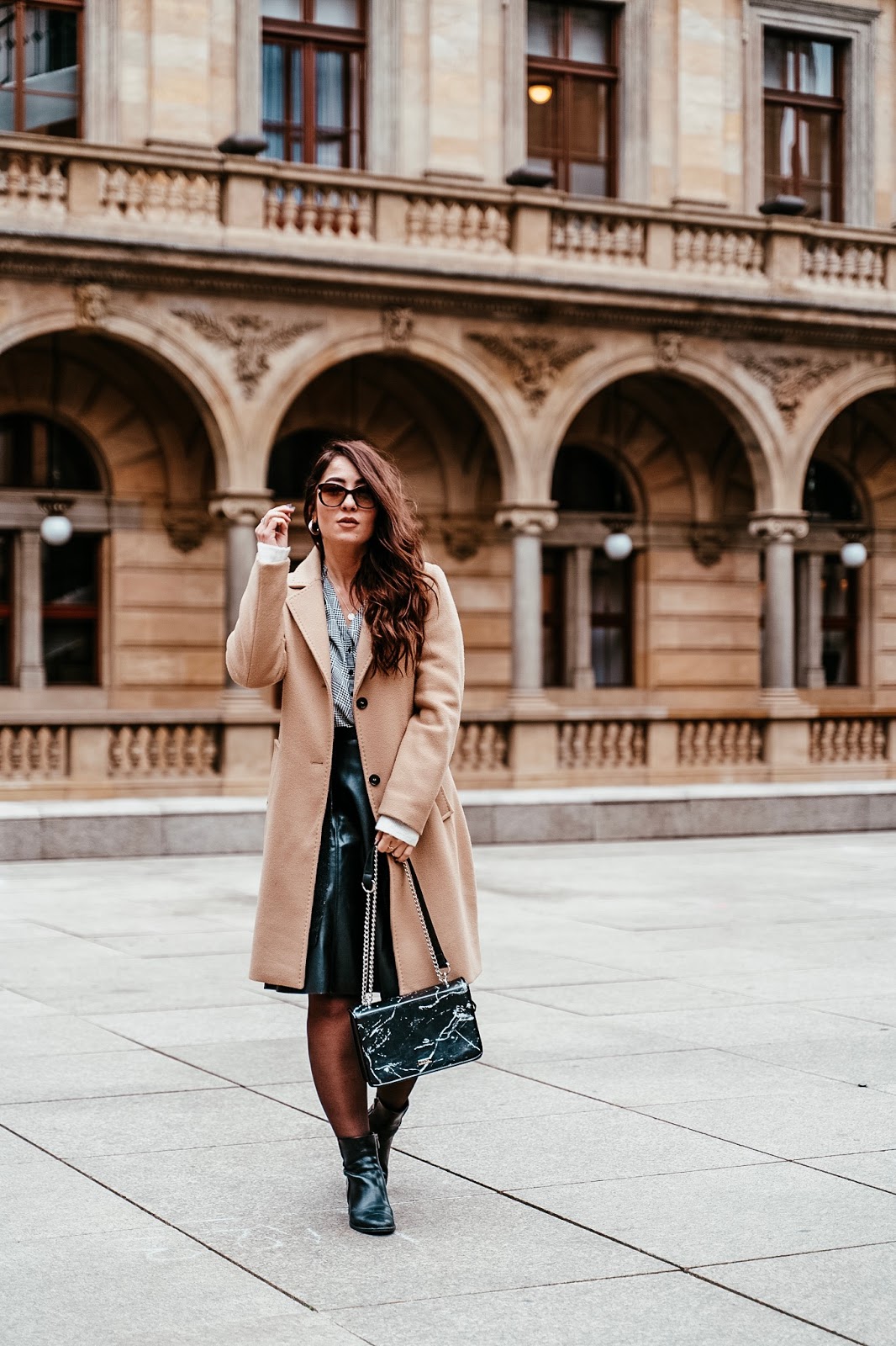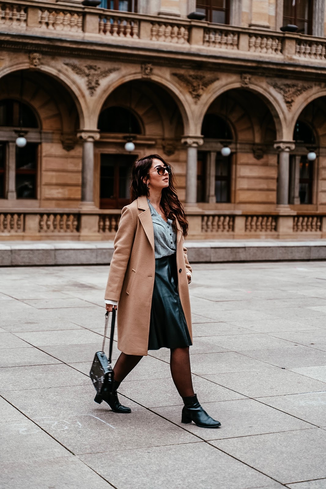 Kabát, svetr, sukně, košile – S.OLIVER / kabelka – DOCA (tato) / boty – ECCO (tyto) / brýle – ELLE (tyto)