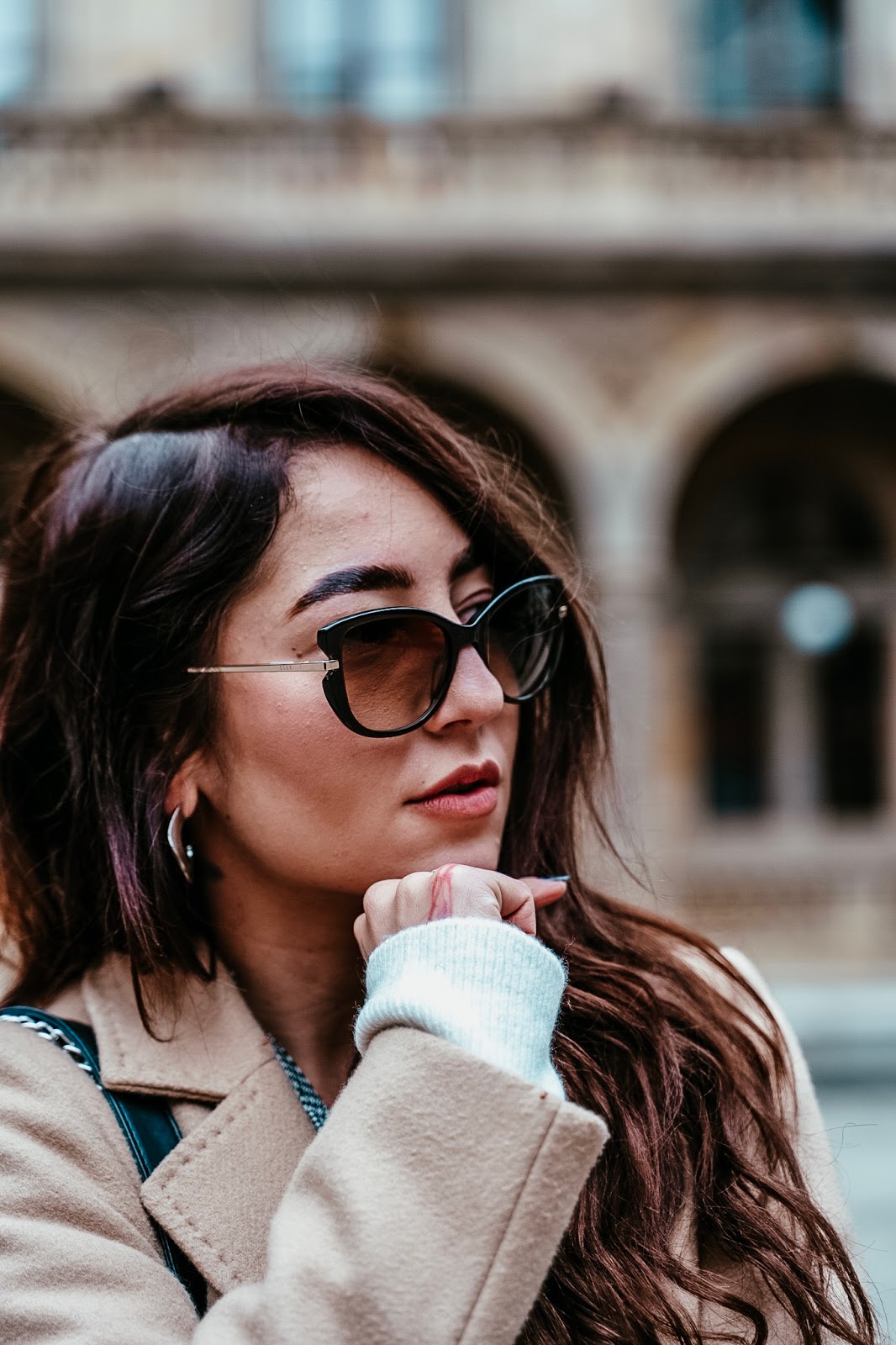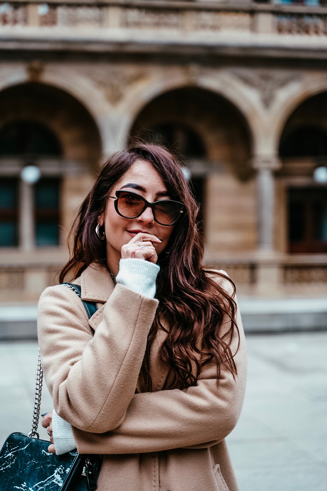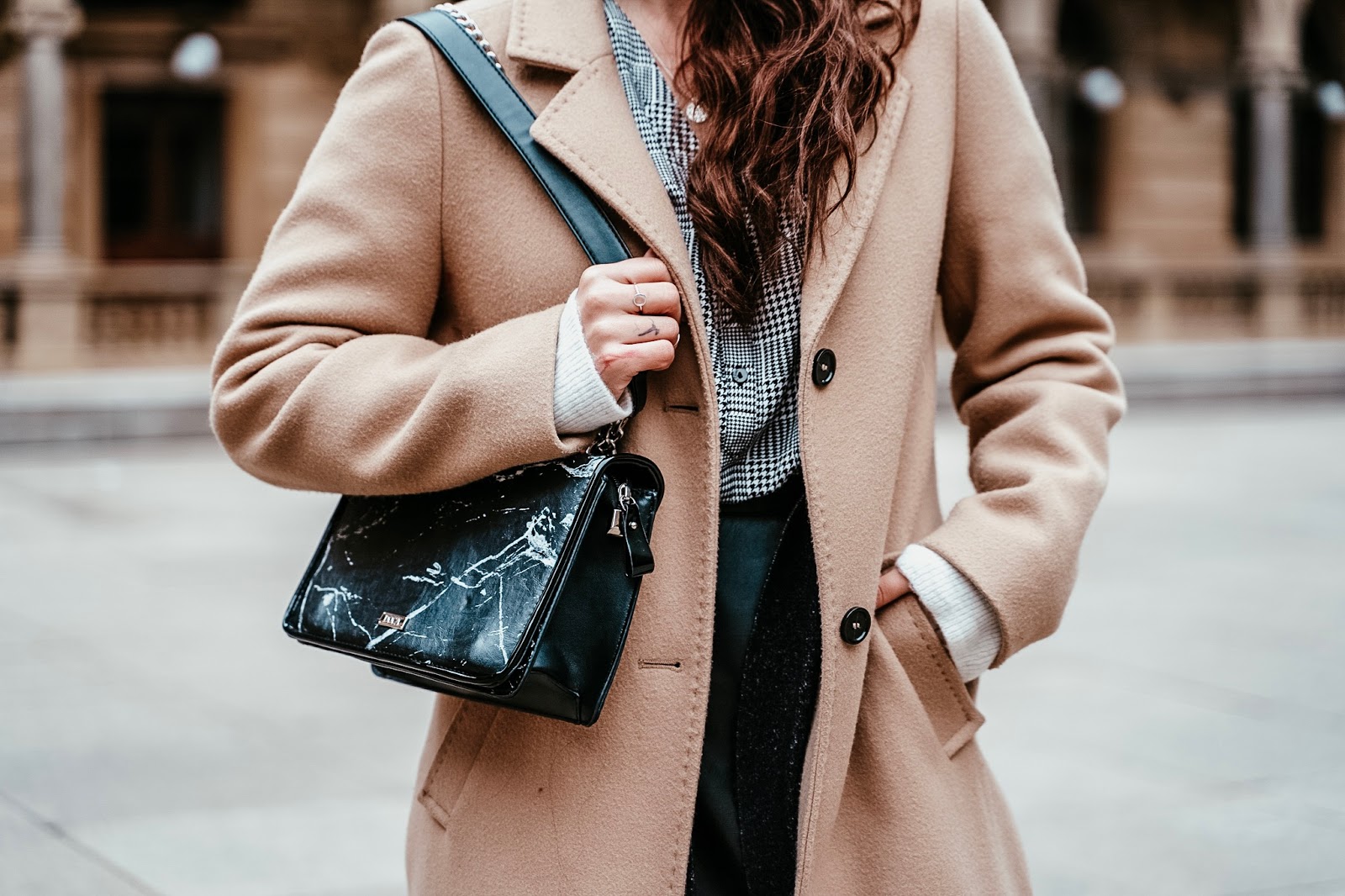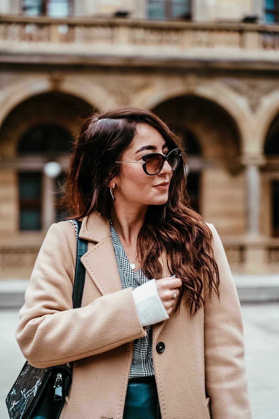 Kabát, svetr, sukně, košile – S.OLIVER / kabelka – DOCA (tato) / boty – ECCO (tyto) / brýle – ELLE (tyto)