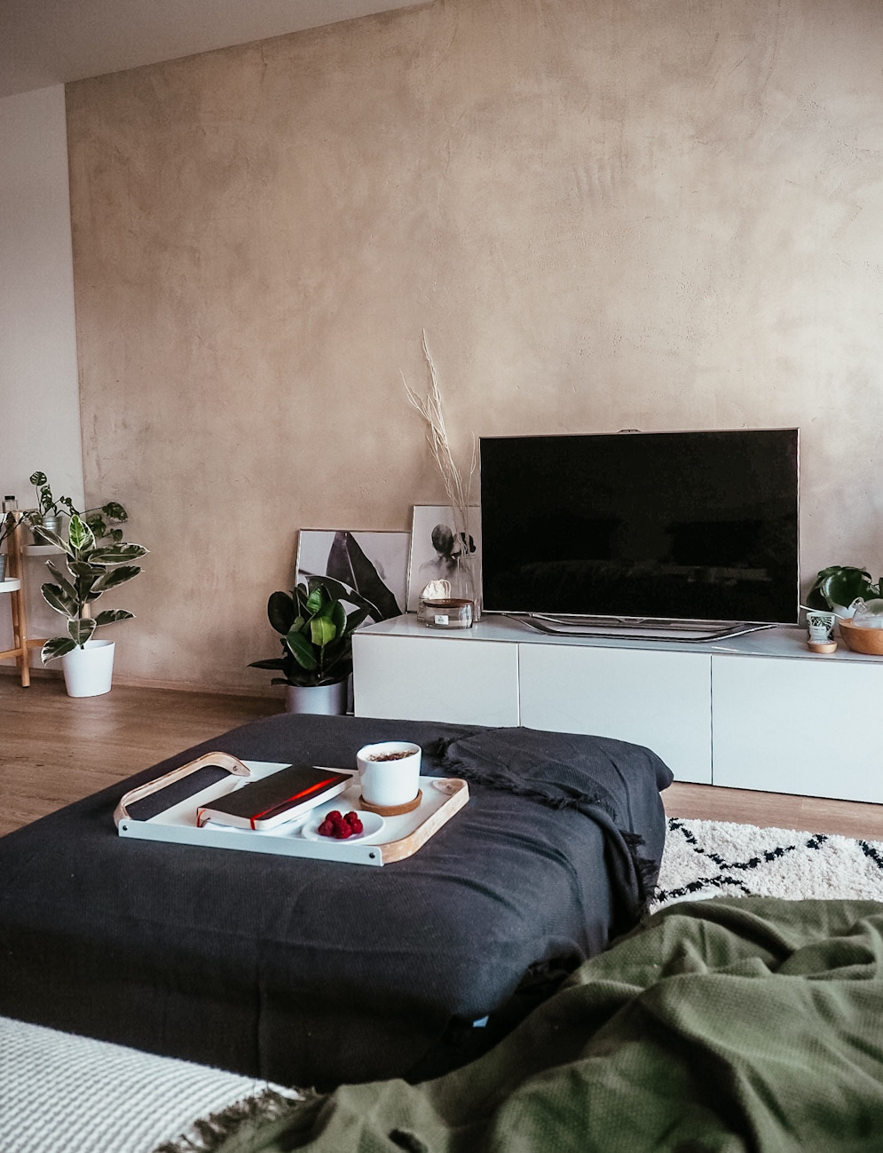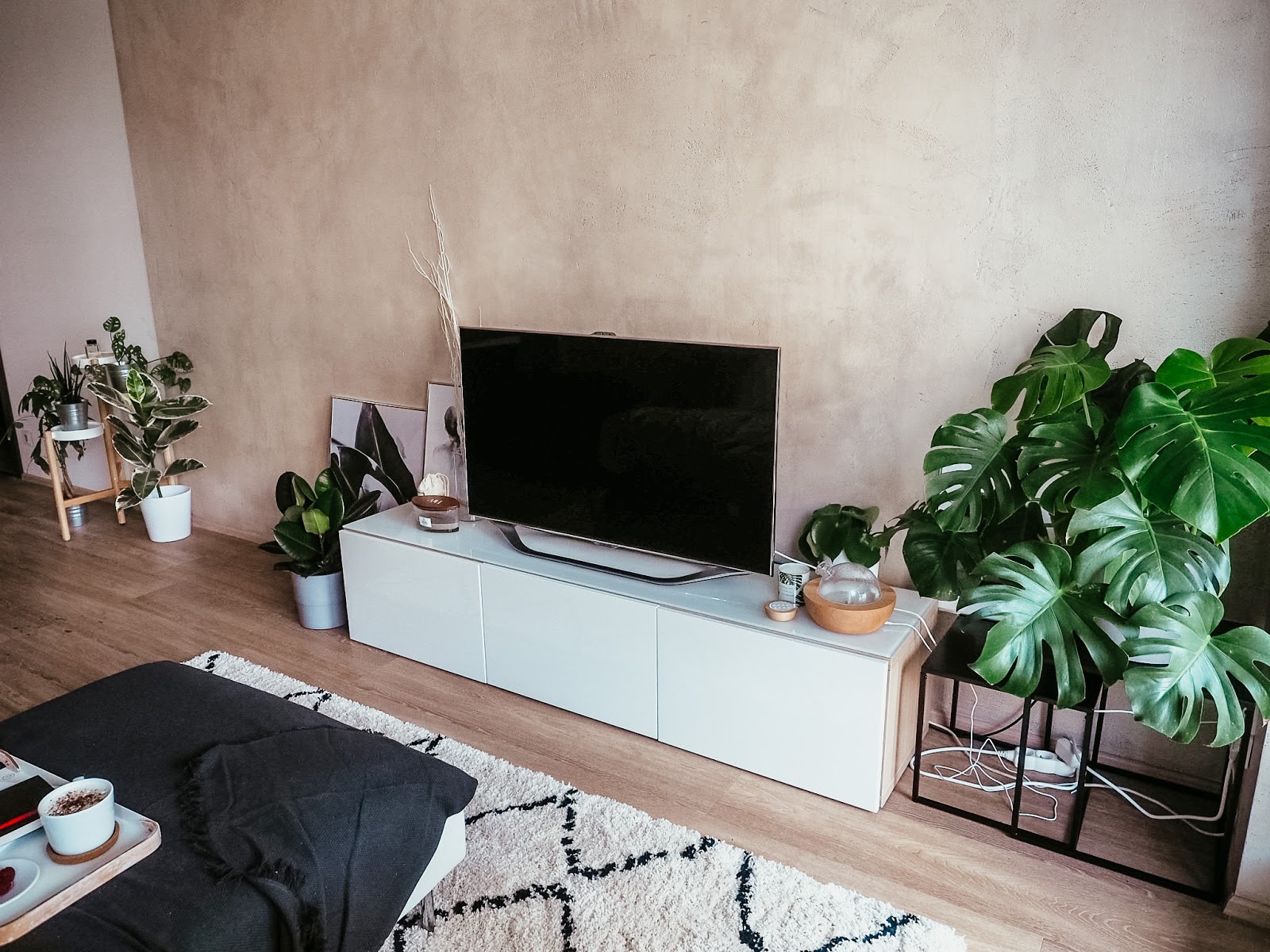 Zabydlovací sérii článků jsem se rozhodla rozšířit o proces vybavování od začátku až do konce u každý jednotlivý místnosti, aby byl někde pohromadě zaznamenanej progres. A začneme u toho, co šlo celkem dlouho uplně stranou. U obýváku. Zaplatit stěrku, sedačku a koberec nebyla žádná sranda a tak jsem si s tím po všech těch prvotních nákladech s kuchyní a dalším k životu značně potřebným nábytkem dávala na čas. Skoro 3/4 roku byla tak takhle hlavní místnost mýho bytu zcela nevyužitá. Stálo tam křeslo, který se mnou procestovalo už 3 byty, místo televize byl jídelní stůl a když už ho nahradila televize, byla dlouho nefunkční a stála na křivý skříni, ze který jsem jednu dobu měla noční můry. O pár měsíců později je z obýváku moje nejoblíbenější místo v bytě, útočiště, kde je mi nejlíp, kde odpočívám, koukám na seriály, čtu si nebo pracuju. A to i díky všem dekoracím a sezónním doplňkům, o kterých dnes bude taky řeč. Tenhle článek totiž vznikl i díky spolupráci s Desenio.