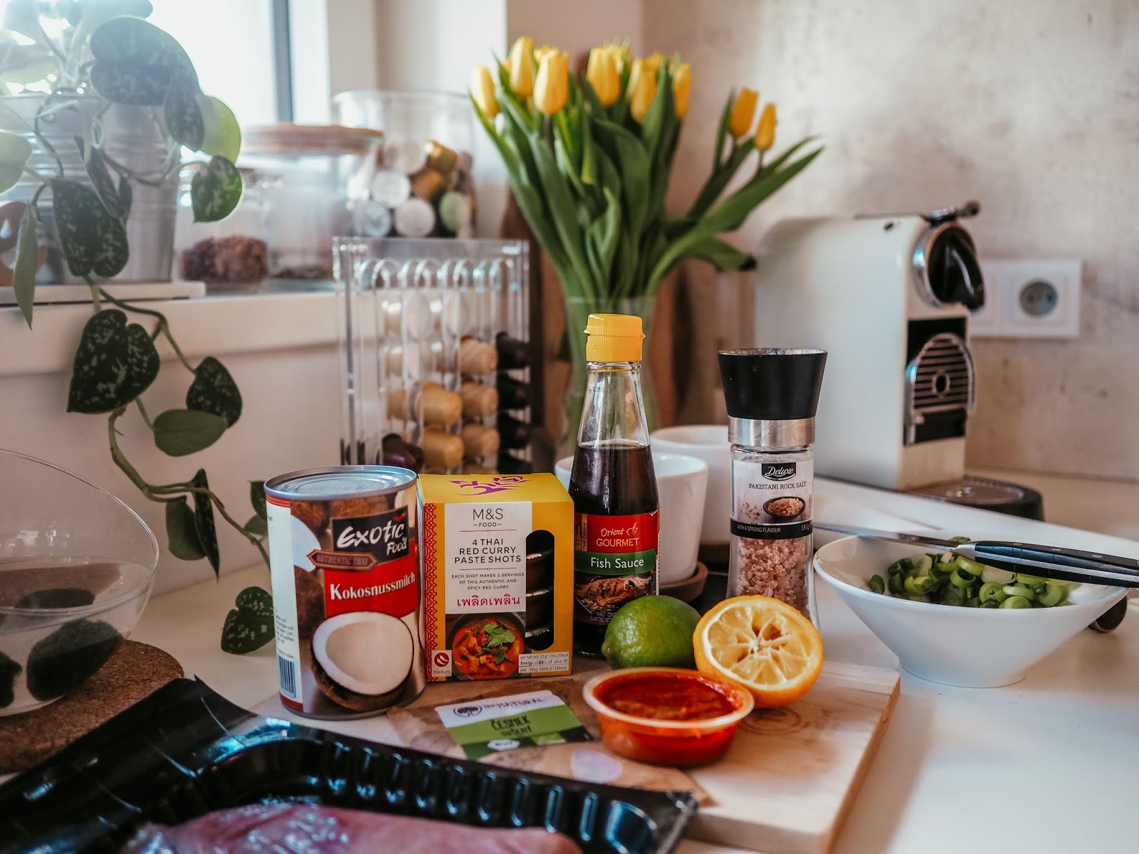 1. V misce smícháme kokosový krém, kari pastu, šťávu z limetky, rybí omáčku a koření. Pořádně promícháme a přidáme nakrájenou jarní cibulku.