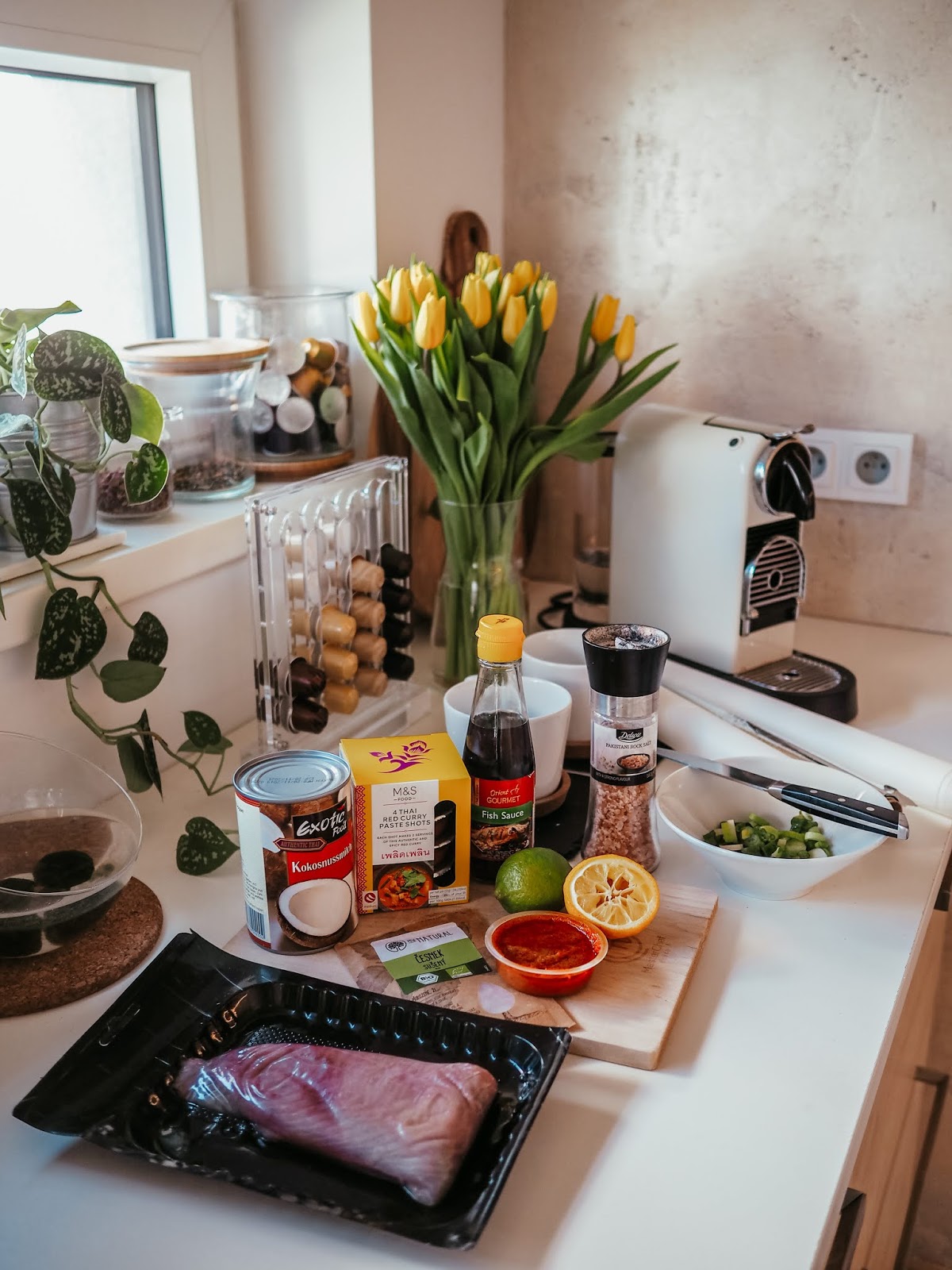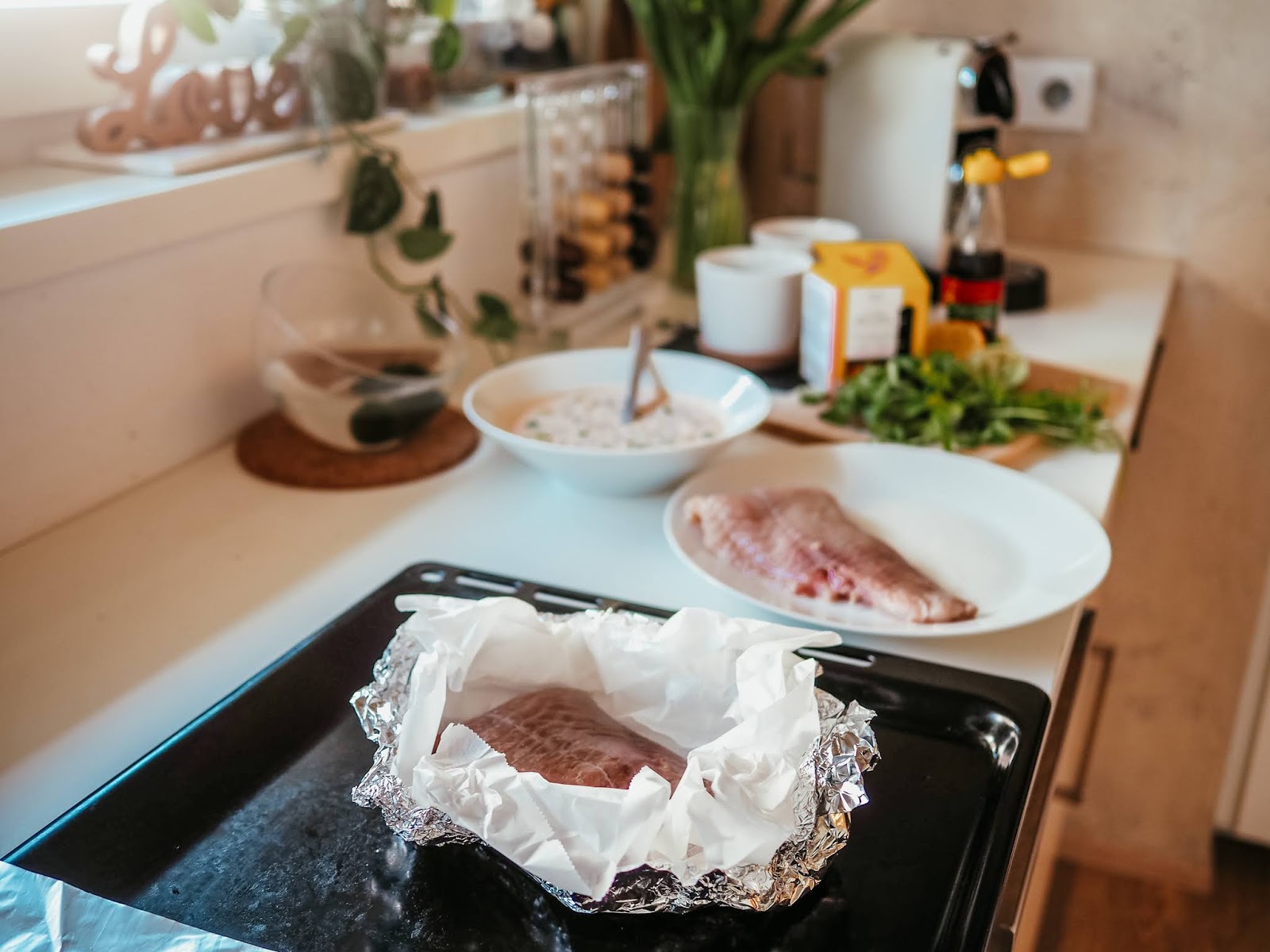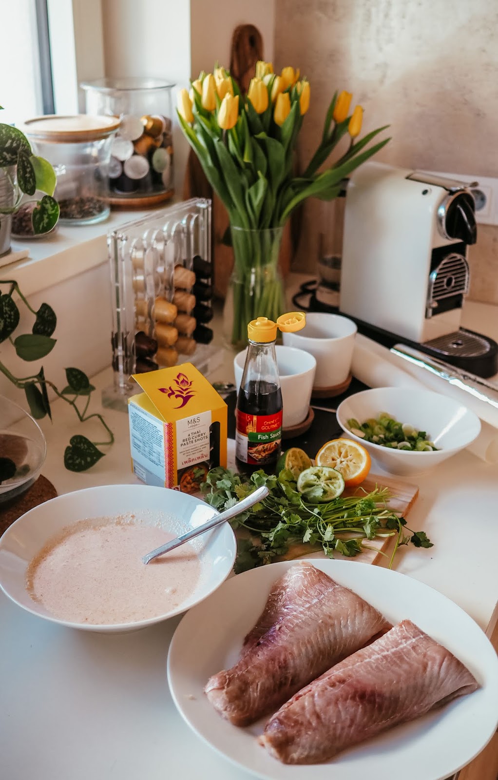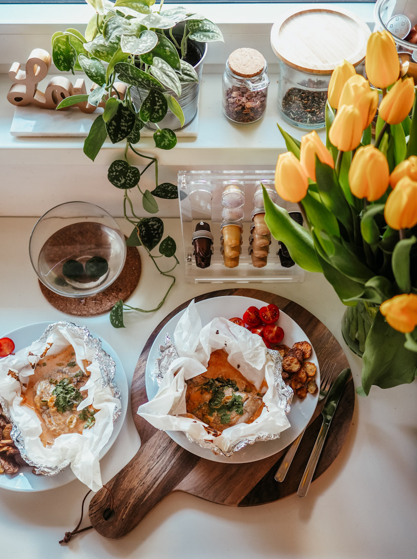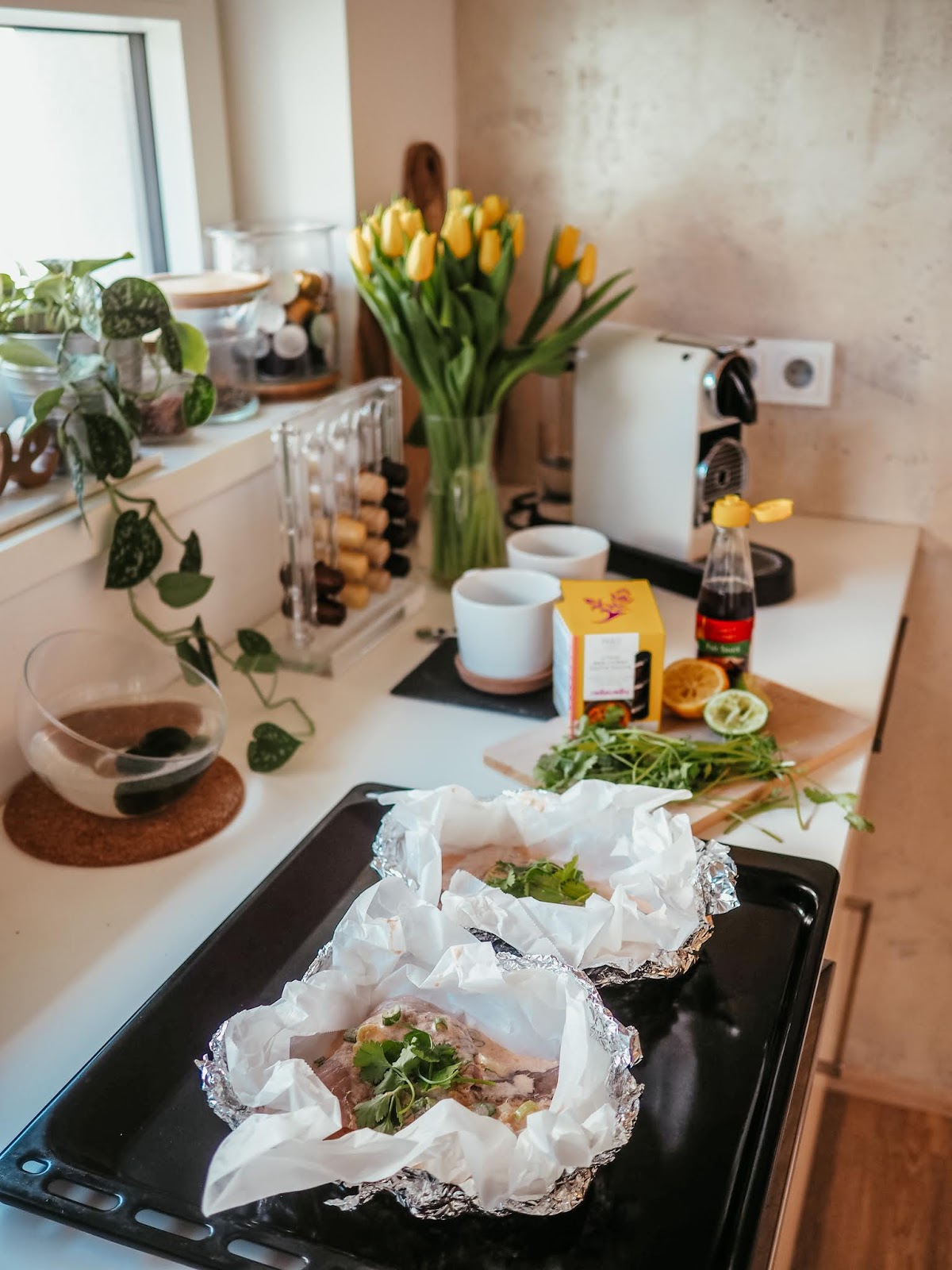 Já vím, já vím. Taky bych tady recepty nečekala. Jenže co člověk zmůže, v karanténě se musím nějak zabavit a lepší než utratit milion za nezdravý jídlo z rozvozu (protože nic zdravýho ke mně nejezdí), je lepší vyzkoušet pár receptů. Když jsem dostala tip na tenhle a prohlídla si celou kuchařku (Revoluce v opravdovém jídle), ve kterém jsem ho našla, řekla jsem si, že to zkusím už proto, že rybu volím málokdy. V podstatě nikdy, pokud ji zrovna nedělá mamka, když jsem v Hradci a nemám jinou možnost. Nebo pokud nejde o sushi.