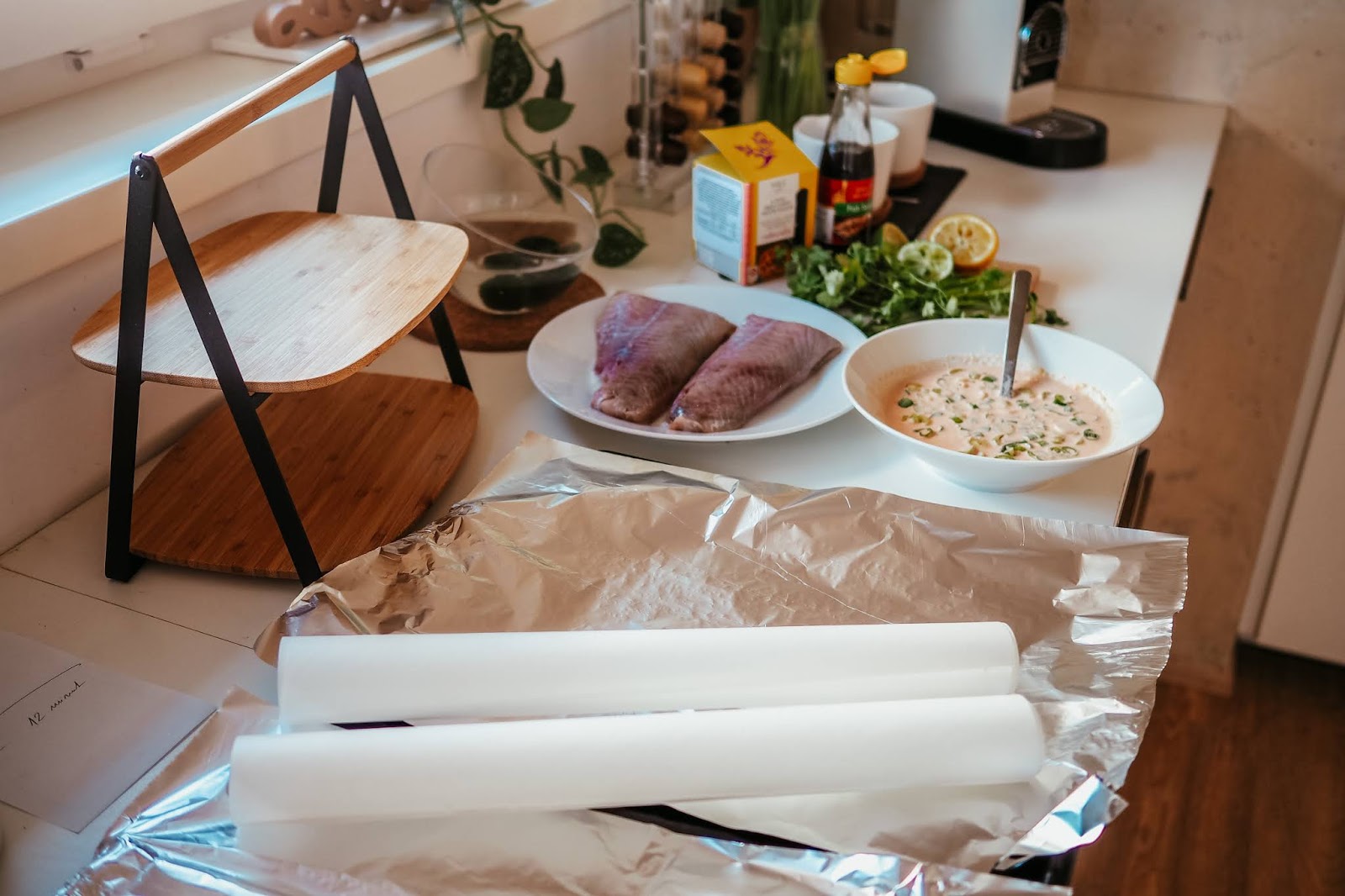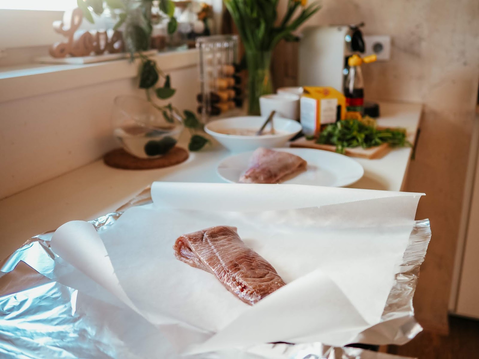 2. Připravíme si arch alobalu a na něj stejně velký arch pečícího papíru. Na to položíme omytý filet a vytvoříme okolo něj pomocí alobalu jakousi kapsičku, ve které bude omáčka držet (dále na fotkách máte ukázku).