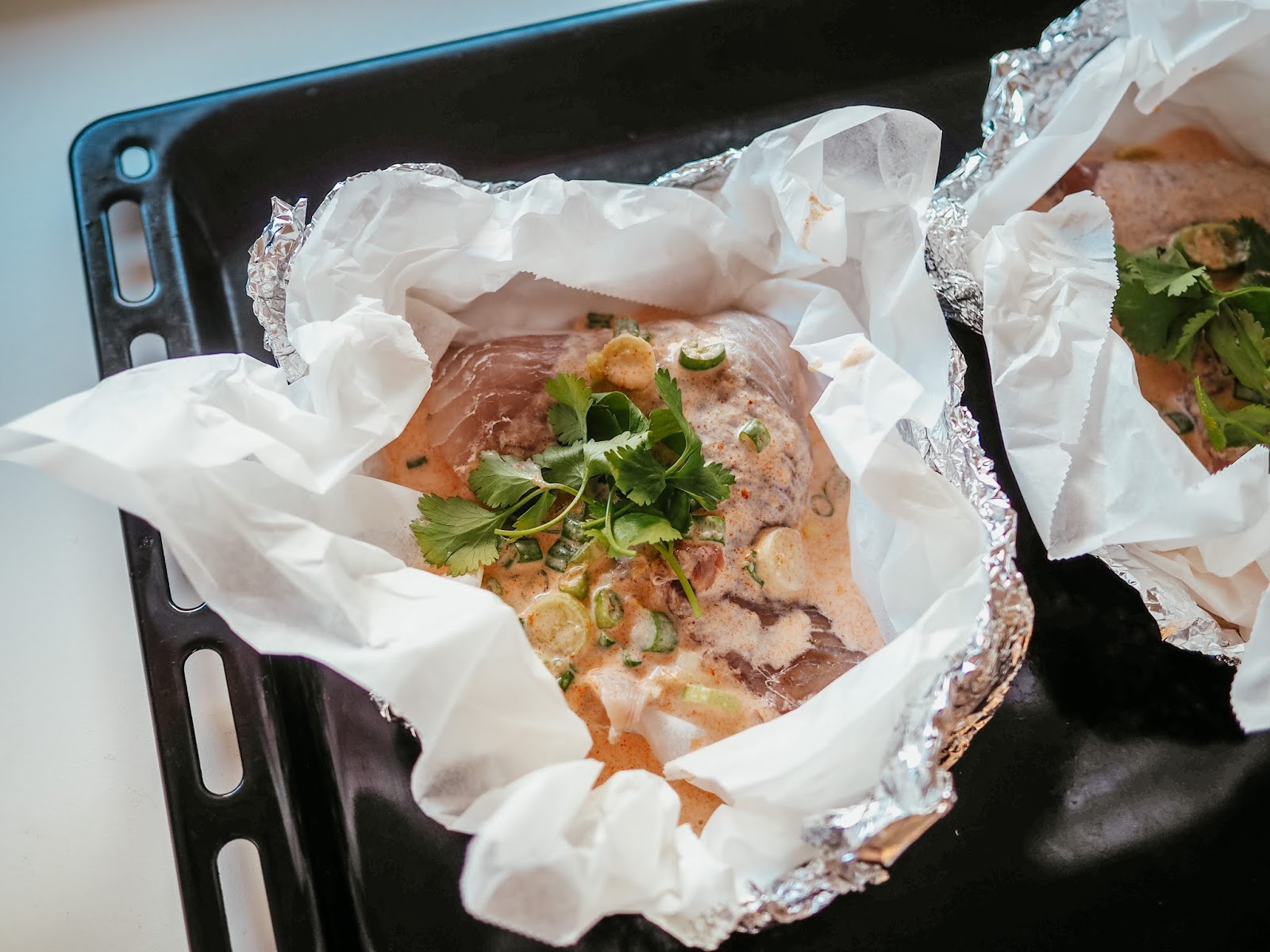 3. Filety zalijeme omáčkou a navrch přidáme koriandr. Pečeme v troubě na 200° 12 minut.