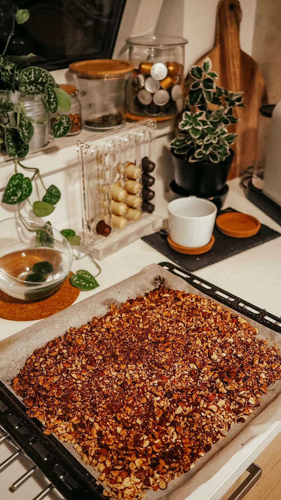 Zjistila jsem ale, že když si ráno dělám delší dobu snídani, zaseknu se u toho a pak se mi nechce vrhat do práce. Takže jsem na to vyzrála tím, že jsem si upekla paleo granolu. Nachystat si ráno jogurt totiž zabere asi 5 vteřin.