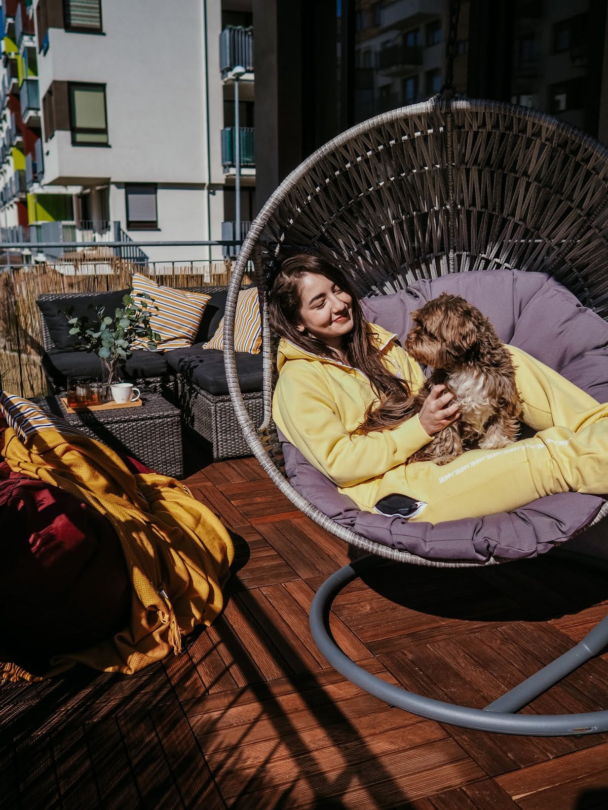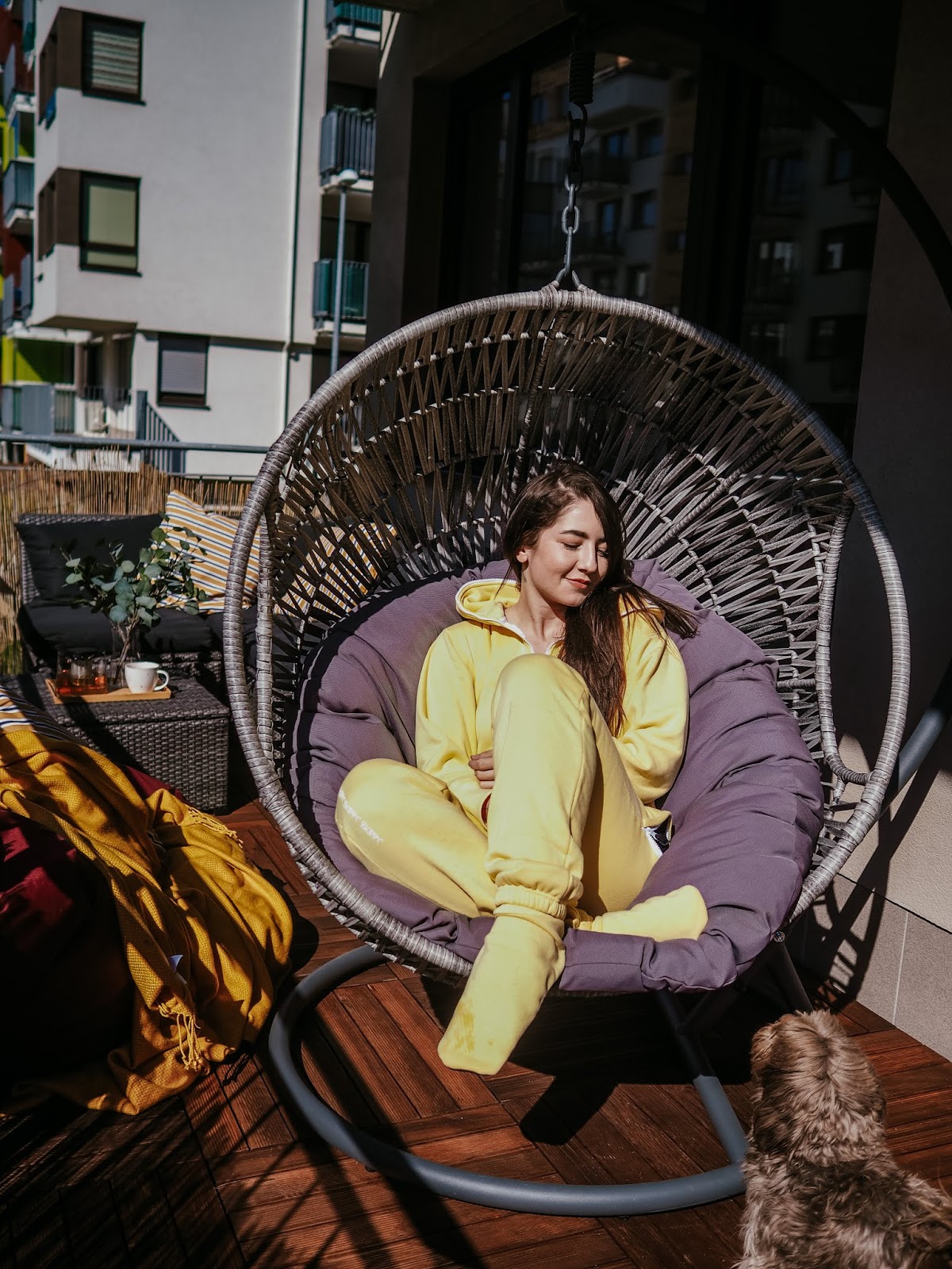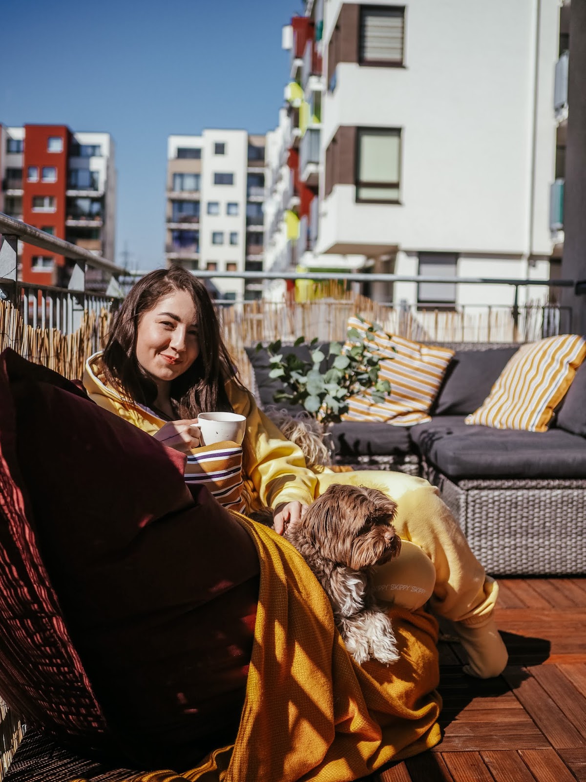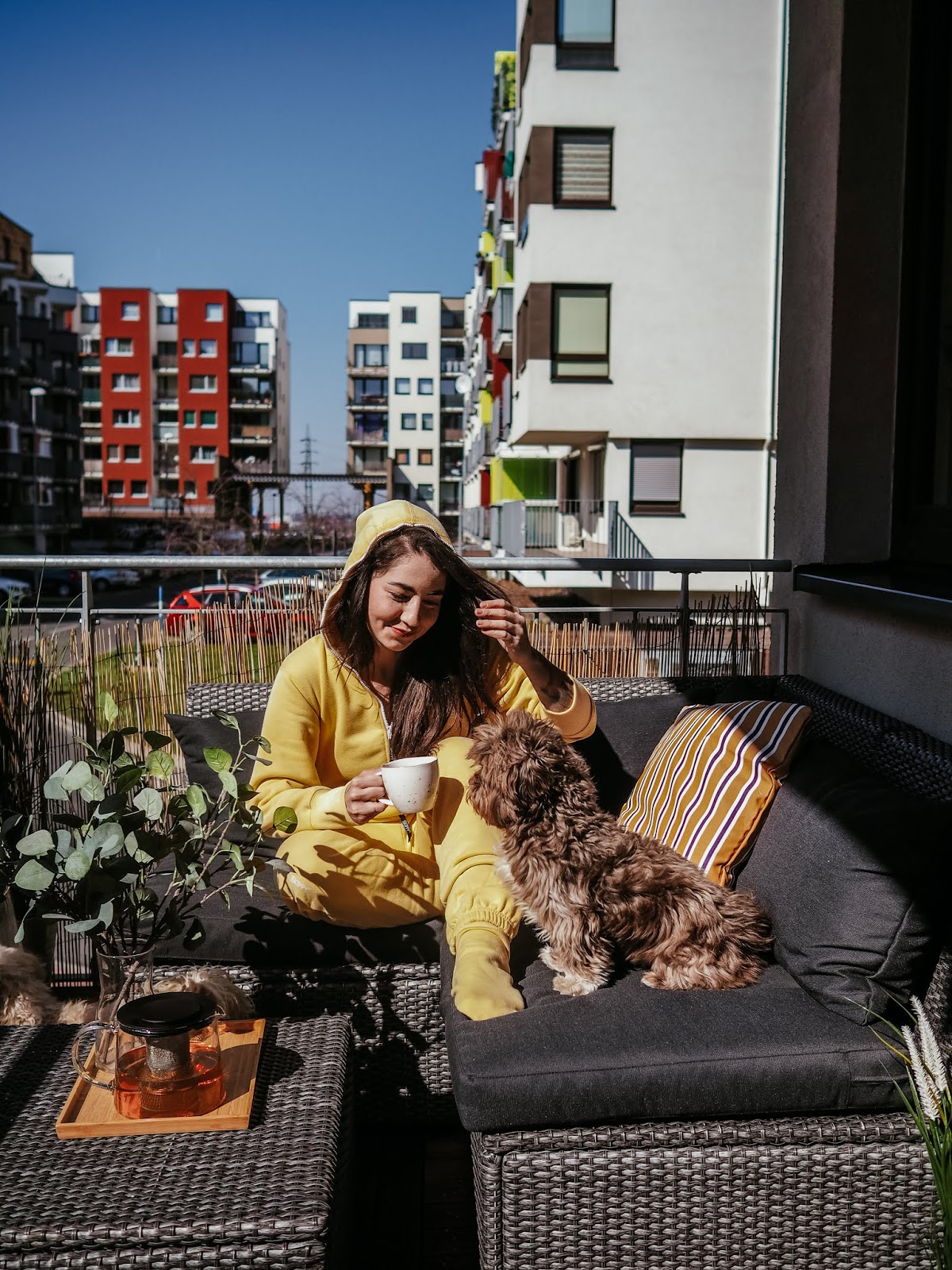 A co teprve ve chvíli, kdy jsem si (i s tou šílenou přirážkou za dovoz, pfff!!) objednala z Ikey poštářky, deky, umělý kytky a lampu a z obýváku vytáhla ven obří sedací pytel, kterej tady už rok překážel. Jak lusknutím prstu se balkon stal mým nejoblíbenějším místem v bytě a s pejskama jsem tam vysedávali a slunili se každej den. Myslim, že z následujících fotek je celkem jasně vidět, jak moc si to užíváme. ❤