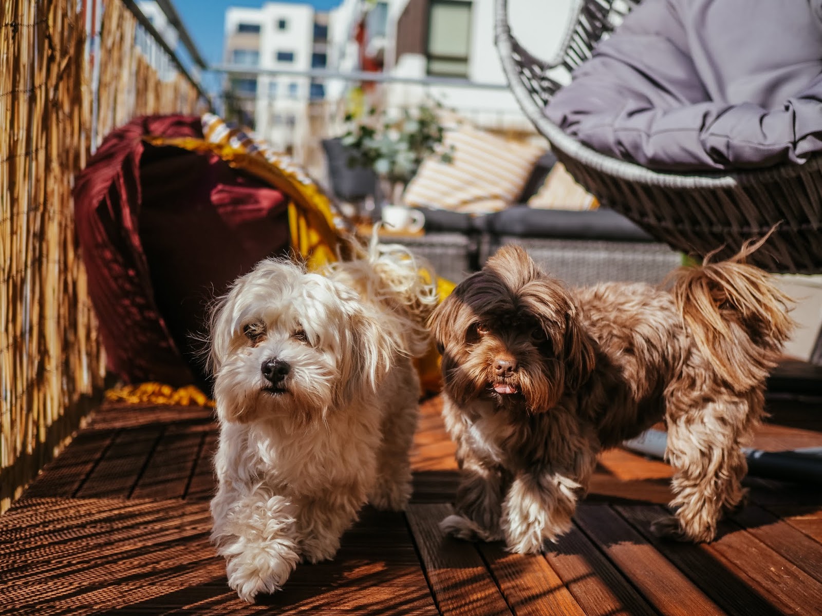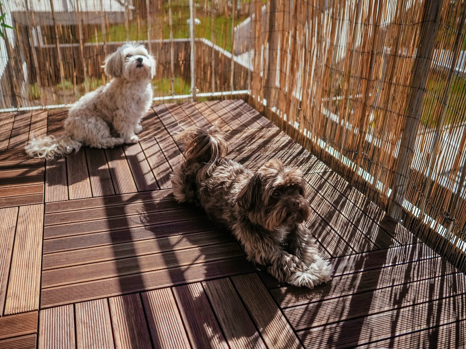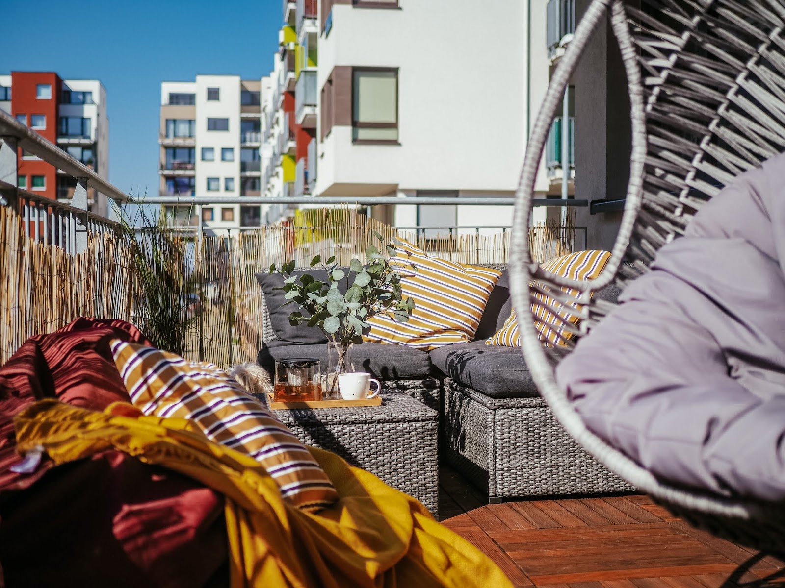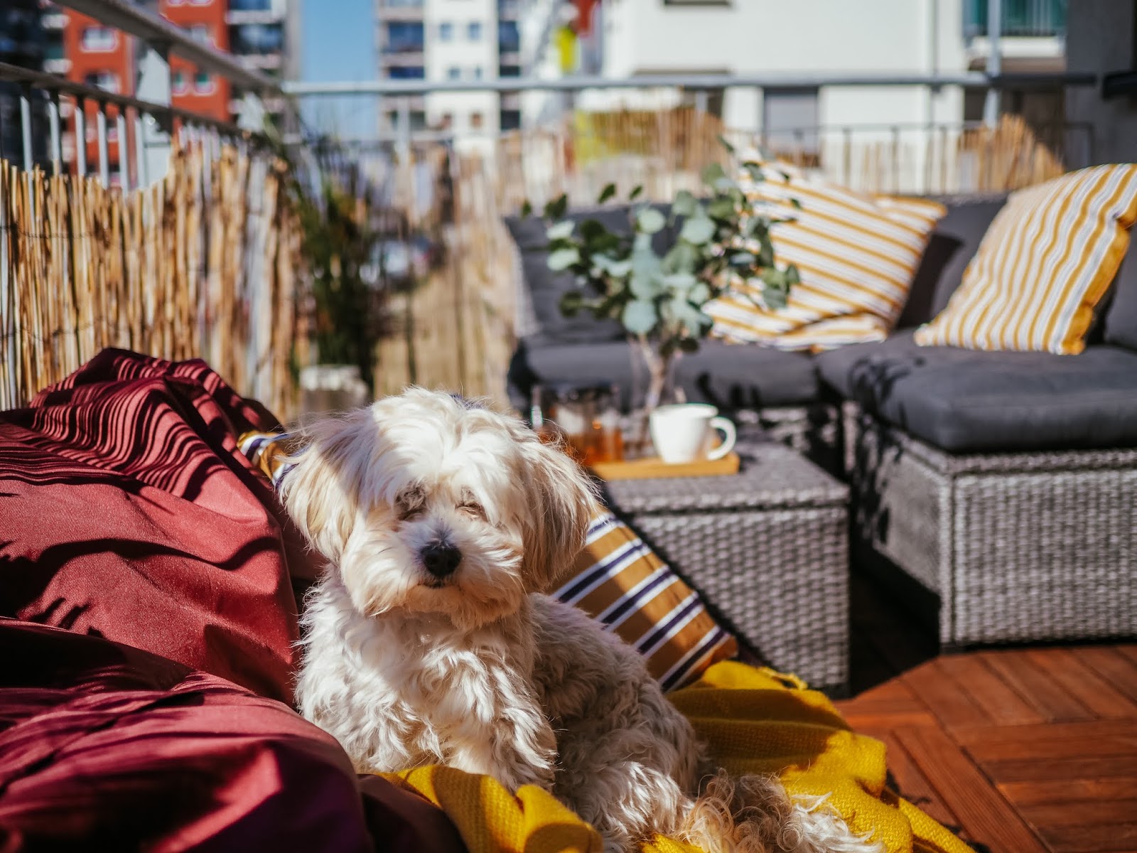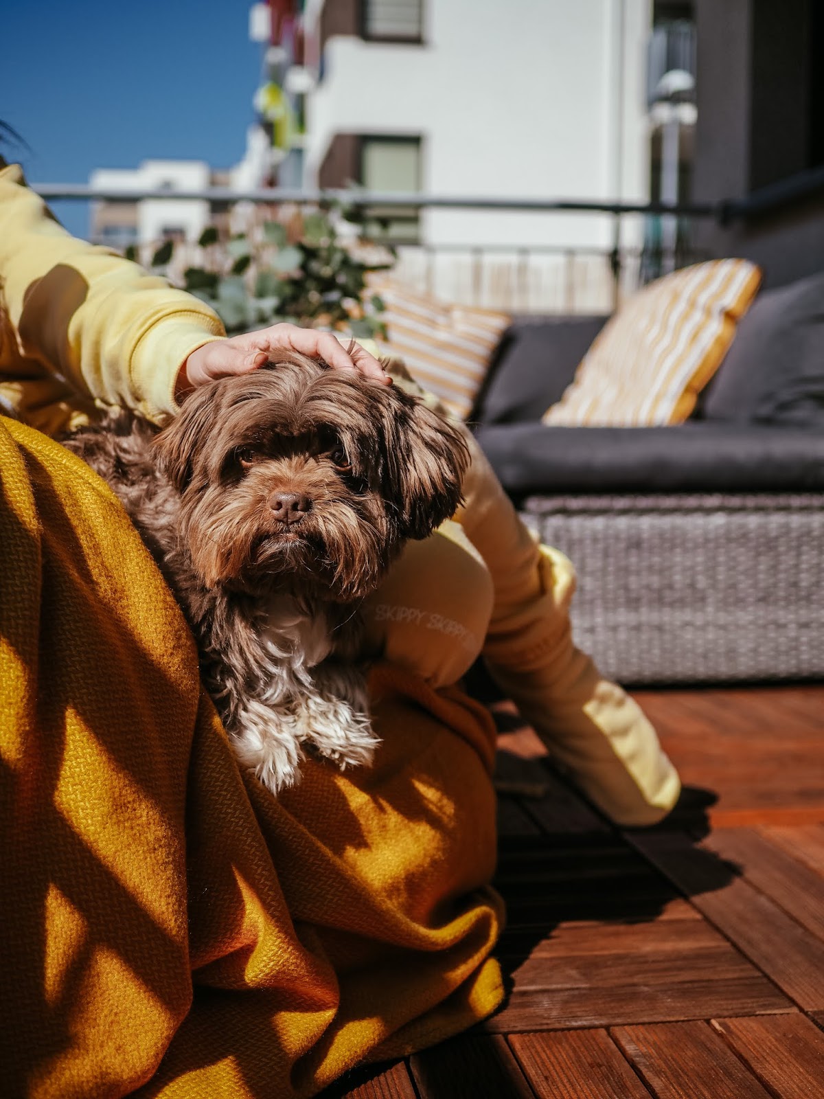 A co teprve ve chvíli, kdy jsem si (i s tou šílenou přirážkou za dovoz, pfff!!) objednala z Ikey poštářky, deky, umělý kytky a lampu a z obýváku vytáhla ven obří sedací pytel, kterej tady už rok překážel. Jak lusknutím prstu se balkon stal mým nejoblíbenějším místem v bytě a s pejskama jsem tam vysedávali a slunili se každej den. Myslim, že z následujících fotek je celkem jasně vidět, jak moc si to užíváme. ❤