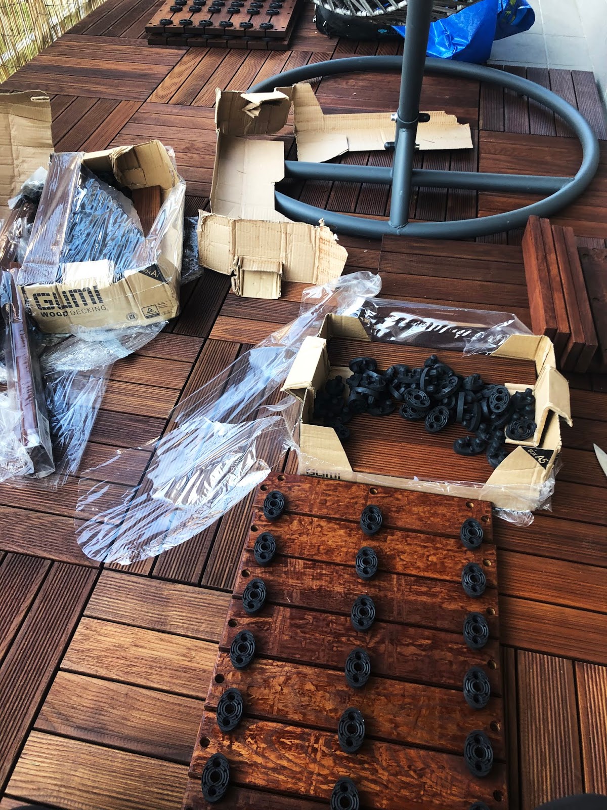 No a na konci léta jsem objevila firmu Gumideck. Málem jsem už koupila tenhle podlahovej systém v Ikee, ale pořád jsem si říkala, že musí existovat něco hezčejc zpracovanýho a fakt dřevěnýho a měla jsem pravdu. Stačilo trochu googlit, projet instagramový hashtagy (konečně jsem podle nich našla něco pořádnýho!) a měla jsem jasno v tom, že tohle chci. Stačilo mi se podívat na všechny ty jejich hotový realizace a nakonec mi bylo líto, že jsem je neobjevila dřív. Domluvila jsem se s nimi na spolupráci, dodala jsem rozměry, fotky a představu položení (dá se to poskládat všelijak, ne jen takhle ve čtvercích, jak to mám já) a na podzim mi domů přišlo několik krabic s podlahou nachystanou na míru. No a ty krabice tam pár měsíců čekaly, až na ně přijde řada.