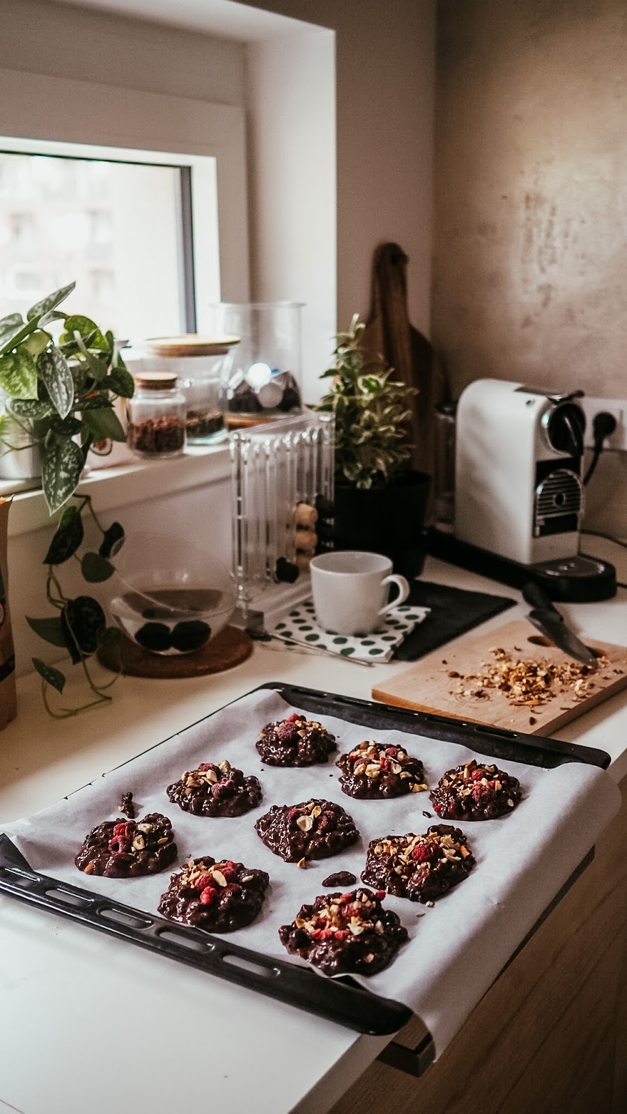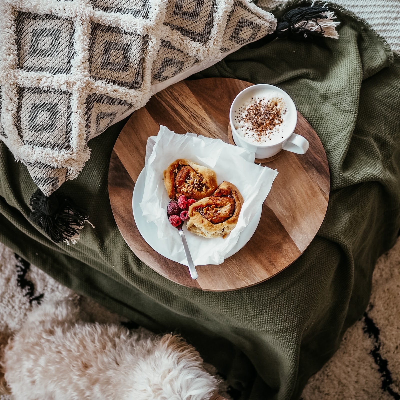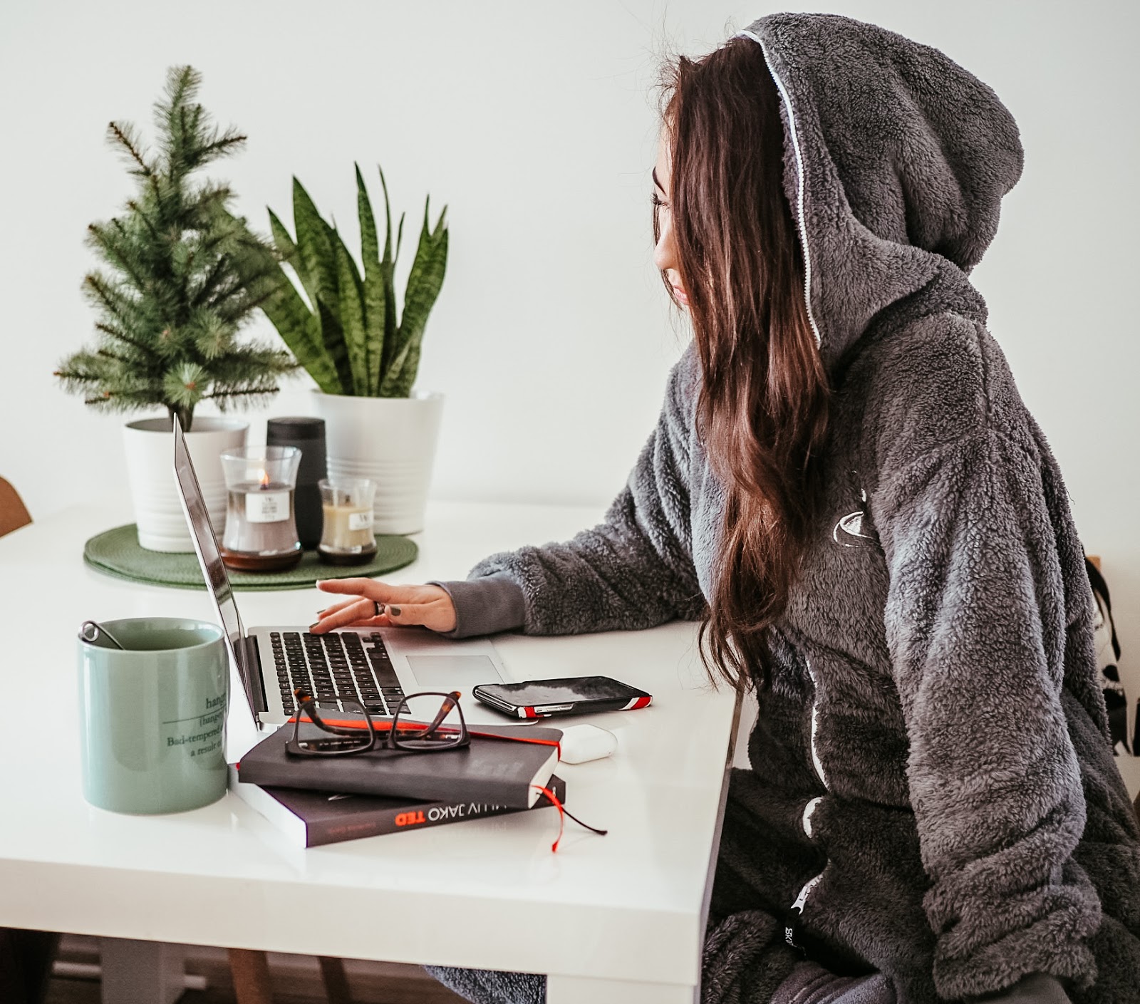 Takže: vůně, teplej čaj, kafe a nějaký zdravý dobroty. Nejlépe ty, co si sama upeču, protože to mě začalo zase bavit. A taky pohodlnej outfit. Bejt celej den v pyžamu podle mě není úplně dobrej nápad, pokud plánujete dělat i něco jinýho než se jen válet. Určitě ale nemusíte sedět doma v nepohodlnejch kalhotech jen proto, abyste se cejtili jako v kanceláři. Já miluju teplákovky, takže si užívám, že je můžu střídat a večer se navlíkám do plyšovejch dupaček, ve kterejch je tak teplo, že v nich můžu klidně sedět o půlnoci na balkoně a přemýšlet o životě. Jo, fakt to občas dělám.