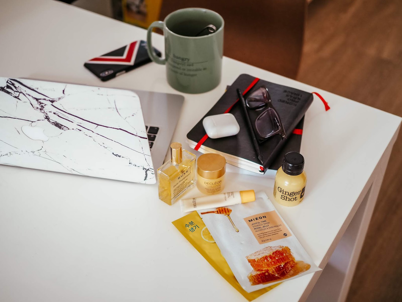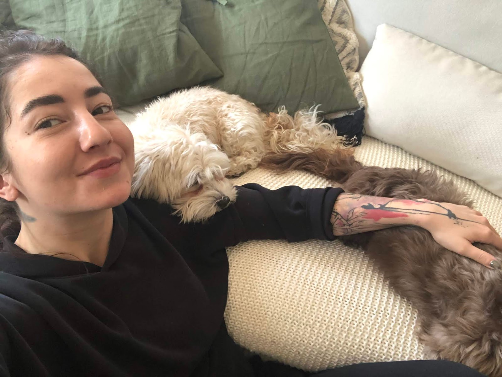 Hydratace, hydratace, hydratace. A to zvenku i zevnitř. Hodně si hlídám svůj pitnej režim, protože se pak cítím lehčejc než když za celej den vypiju 3 kafe a jen skleničku vody. Kromě kafe a (hodně) vody teď piju i dost zelenejch a zázvorovejch čajů a občas do sebe kopnu nějakej ten ginger shot. Nicméně to hlavní, čemu se v tomhle hydratačním směru věnuju na maximum, je péče o pleť. Od ledna jsem s ní hodně bojovala a pořídila jsem si spoustu produktů i přístrojů s cílem ji zlepšit. A tahle karanténa mi celkem nahrála do karet, protože mi umožnila pleť vůbec nezatěžovat líčením a sledovat, co má na ni jakej vliv. Co se klasický péče týká, kromě Minéralu 89 od Vichy (ten používám denně) si obden dopřávám nějakou masku. Většinou se jedná o plátýnkové masky, které mám v lednici a po ránu (nebo i během nějakýho unavenýho dne) mě skvěle proberou. Pleť vyživěj, takže jsem se konečně přestala loupat a konečně mi zmizela i většina pupínků. Zároveň se mi taky povedlo vysledovat, jak velkej vliv má na pleť strava (you don’t say… ehm) a jakmile mi došly všechny ty zmrzliny a čokolády, ta pleť se taky zklidnila.