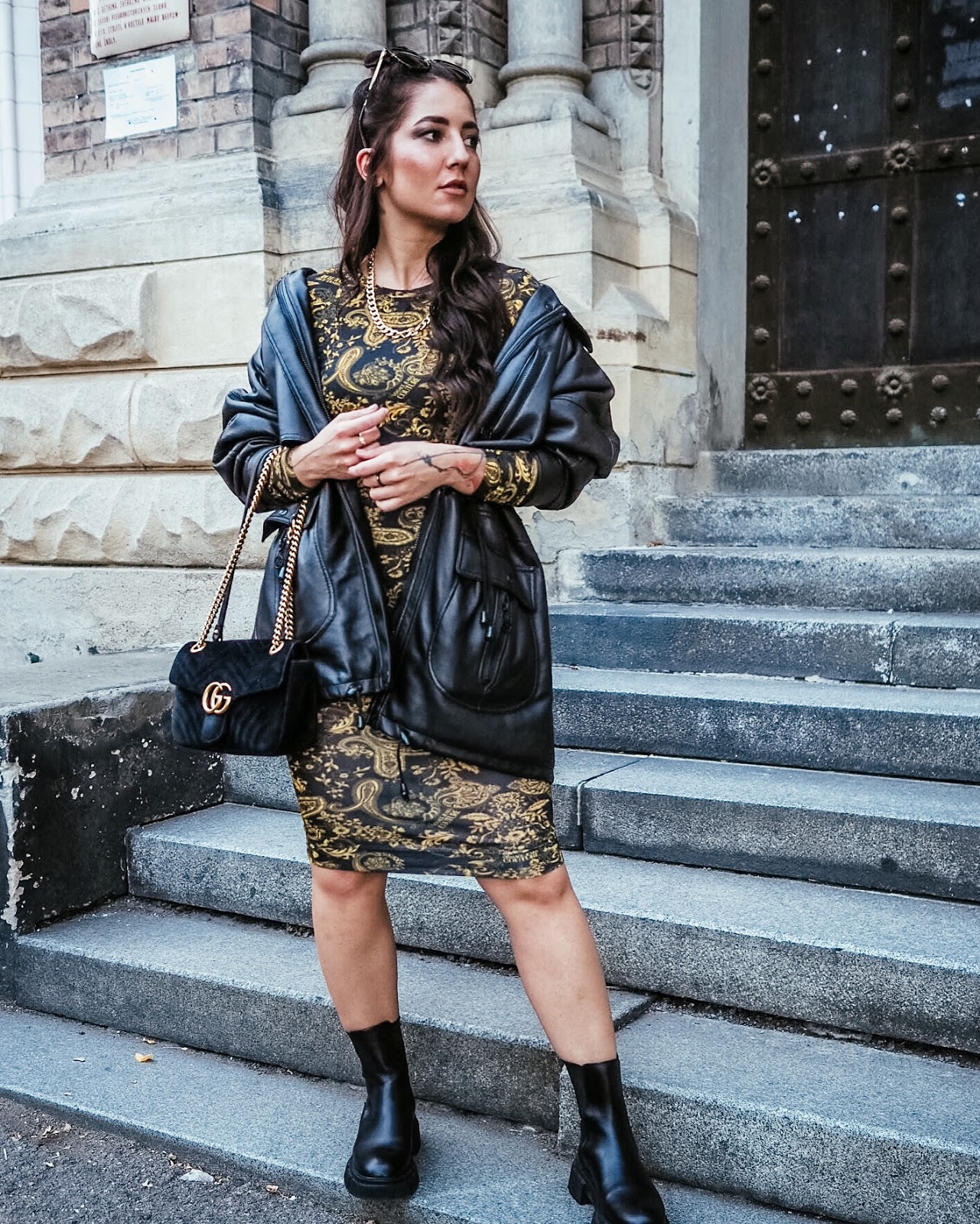 Druhej outfit mi poskládala stylistka Míša. Versace šaty, velmi oversized bunda ze sekáče, k tomu výrazná kabelka, řetěz na krk a velký boty. Jo, prostě je to celý uplně přehnaný a to mě na tom bavilo. Včetně výraznýho make-upu. Nikdy jindy byste mě takhle nepotkali.