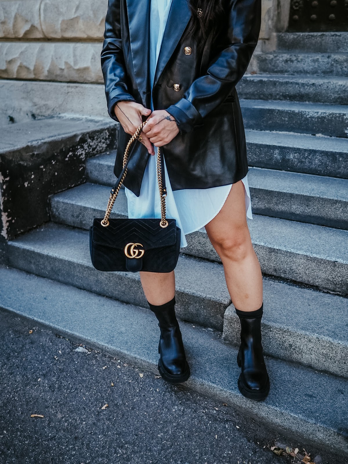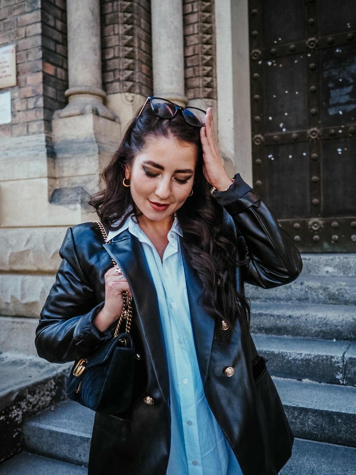 Poslední den jsem to byla nejvíc já. Outfit jsem si poskládala z úlovků ze Zary. Košilový šaty, kožený sako se zlatejma detailama a boty, který jsem hledala už několik týdnů. Není to totiž zrovna lichotivej kousek k mýmu typu postavy, ale věděla jsem, že najdu nějaký, se kterýma budu spoko a budu se v nich cejtit dobře. A přesně to se stalo, nejradši bych je nesundávala, líběj se mi ke všemu. Výrazný oči mi zase dělala Míša a já si to tento týden budu zkoušet i sama. Třeba se to jednou taky naučim!