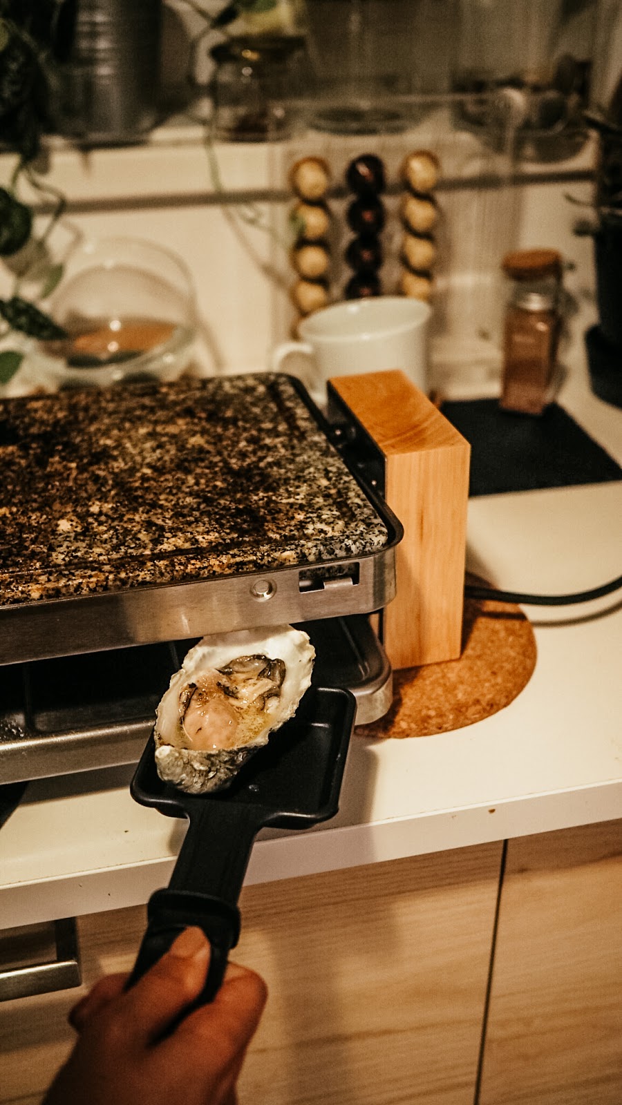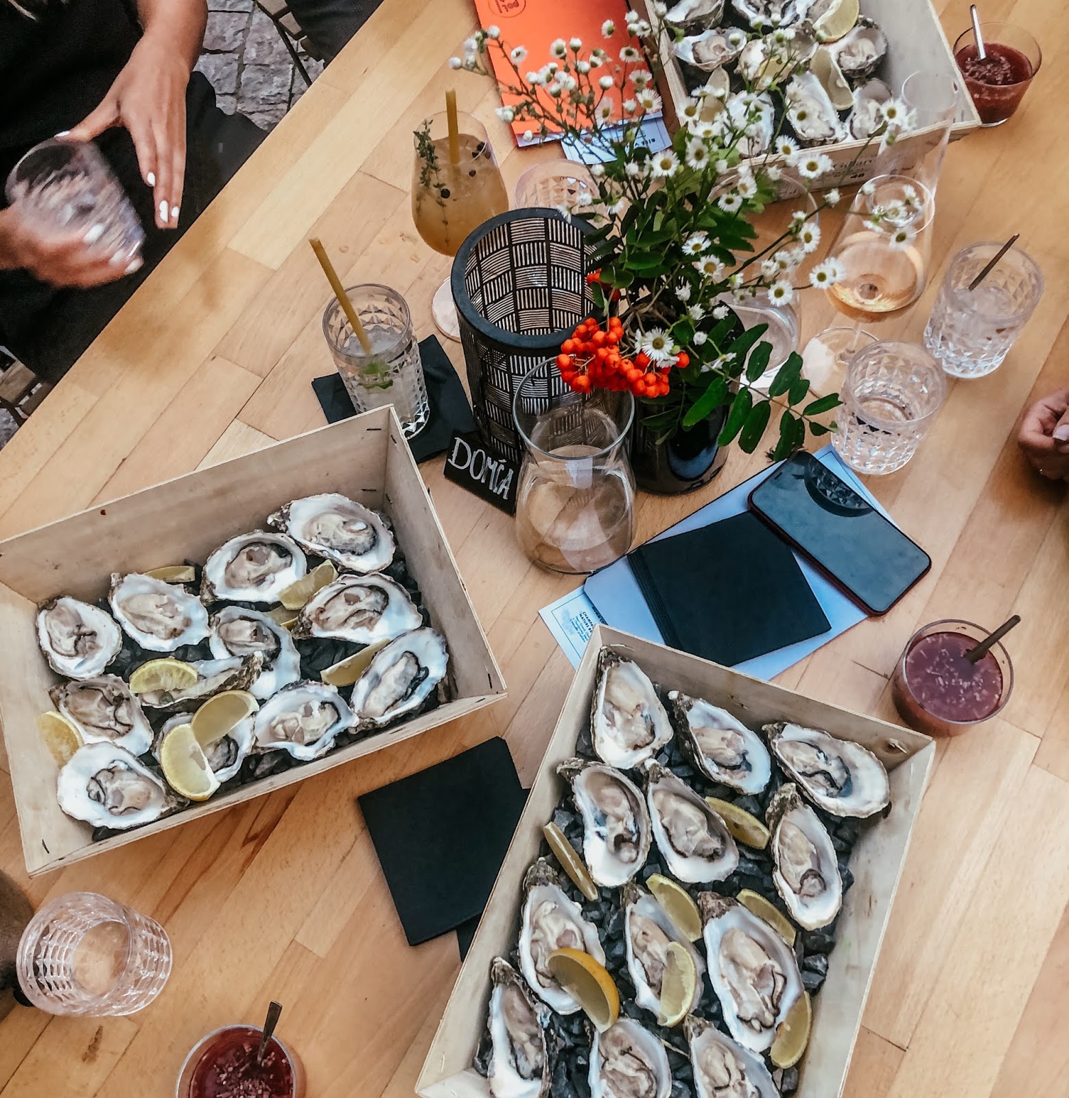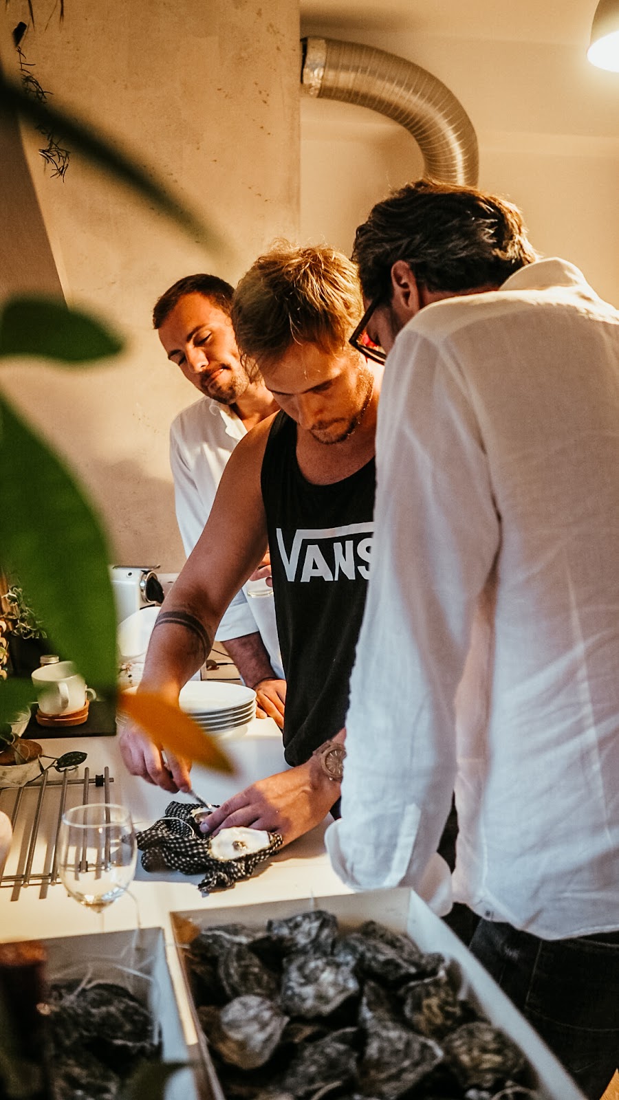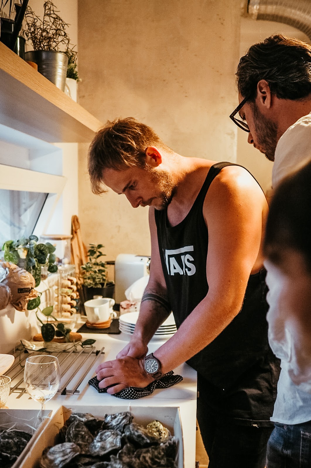 Tentokrát to teda byl trochu jinej level. Úplnou náhodou jsme po naší ústřicový večeři dali dohromady plán, že si objednáme vlastní bednu (nebo dvě) a uděláme si ústřicovej večer u mě doma. Celý nám to zařídil Petr, šéfkuchař Nejenbistra, kterej nás nakonec celej večer učil, jak je otevřít a jak si je co nejlíp dochutit.