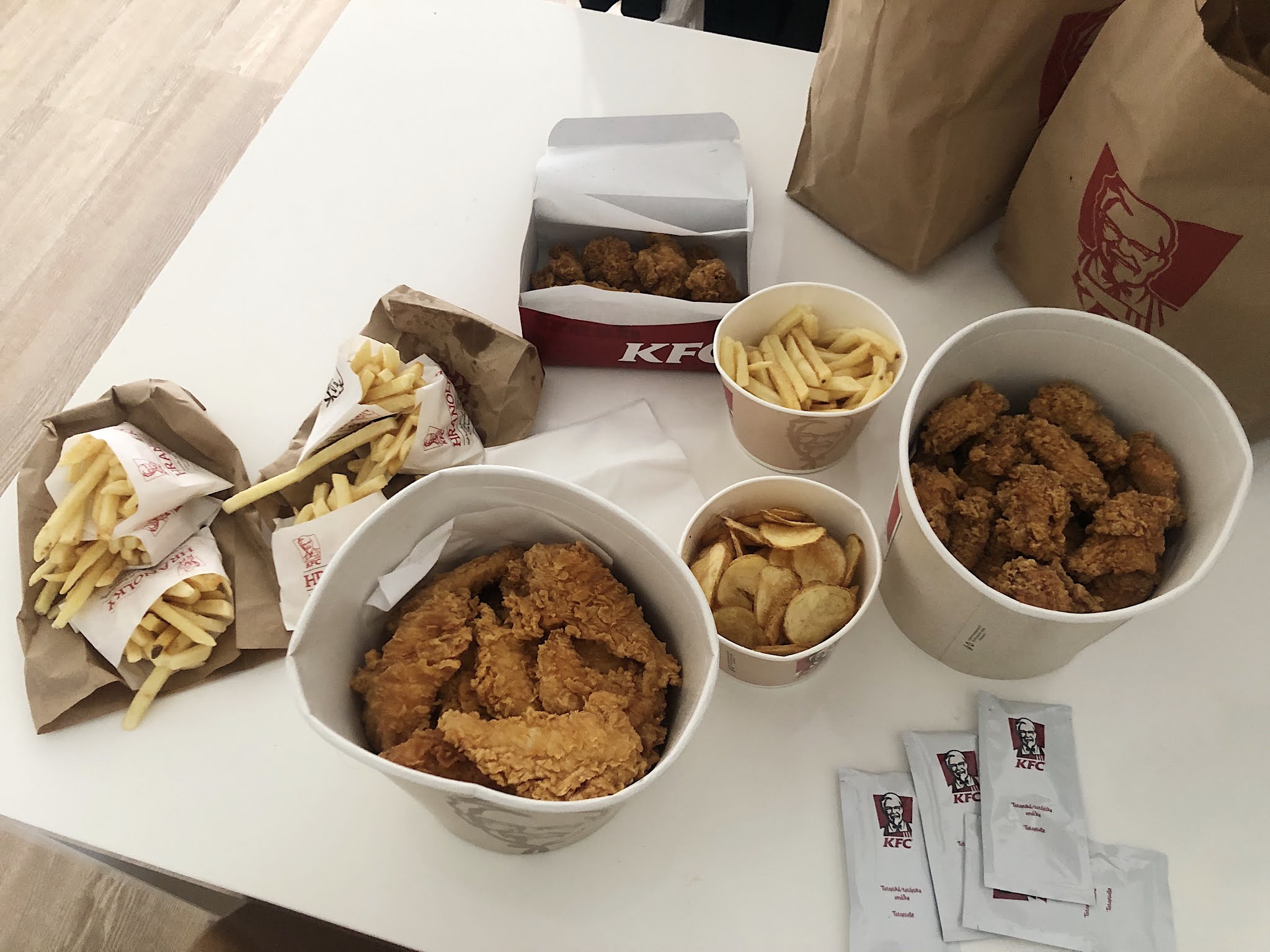 Výživný rozhodně nebylo tohle menu. Pokud ale bylo tajným cílem tohohle oběda pro dva (původně, nakonec ho jedli 4 lidi 4 dny :D), mi konečně znechutit KFC, tak se povedlo, od tý doby jsem ho neměla.