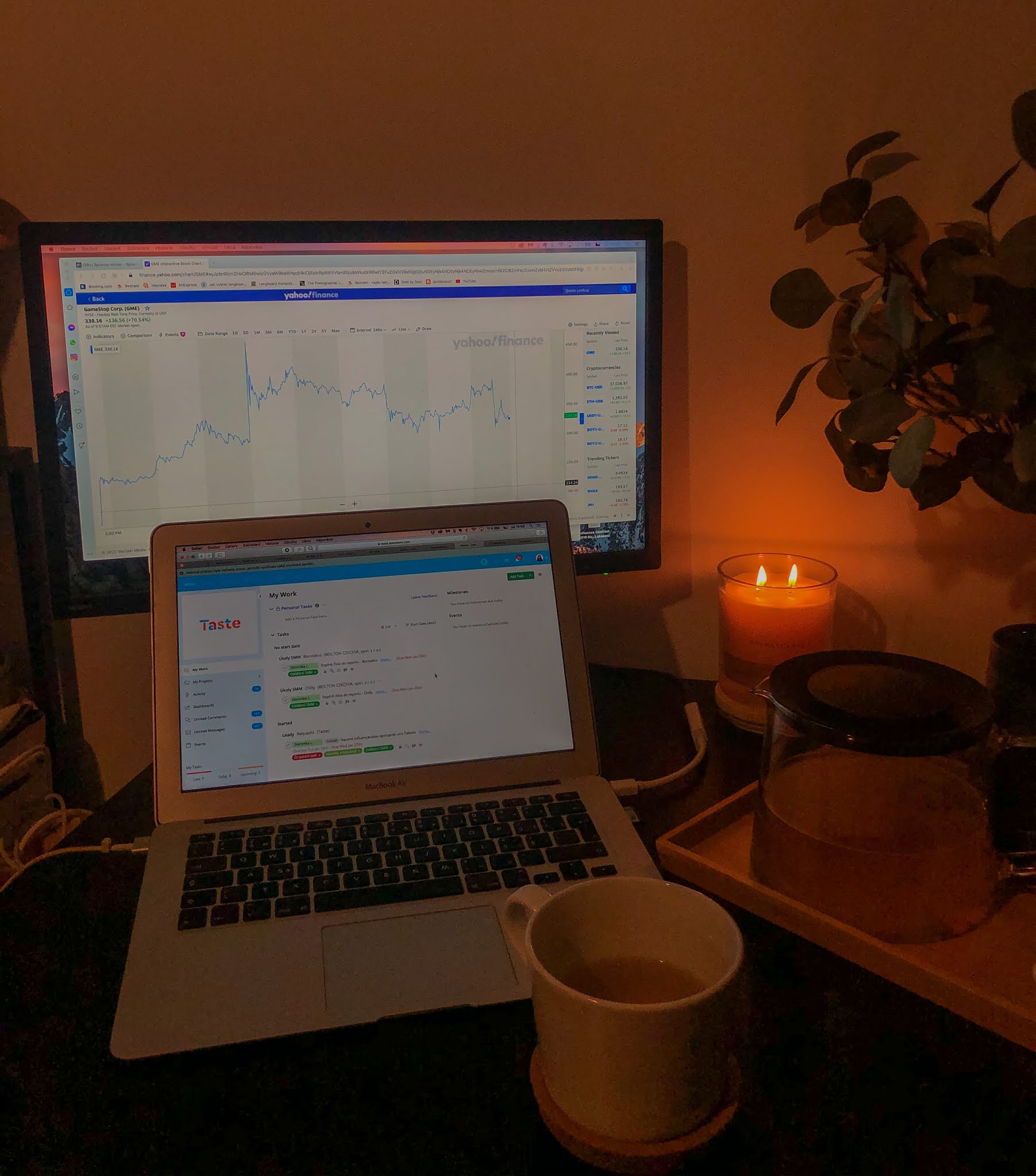 Domácí kancelář od 15:30, kdy se otevírá burza. Aneb jak jsem v rámci Gamestop kauzy naskočila do akciovýho šílenství a naučila se během týdne spoustu věcí.