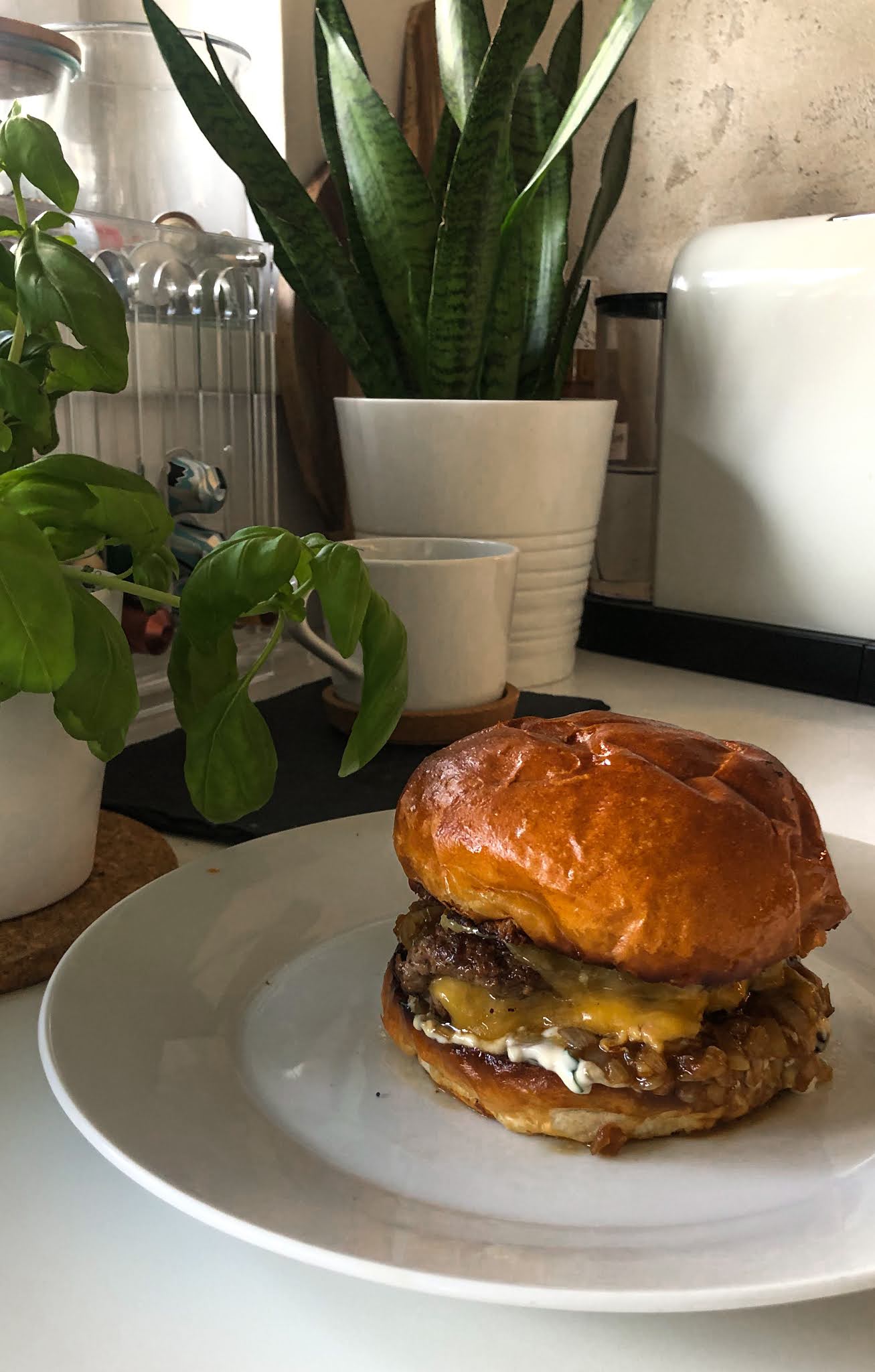 Domácí smash burger, kterej chci jíst do konce života. Maso zapečený s cheddarem, cibulka povařená v demi glace a majonéza z pečenýho česneku (+ teď i medvědího samozřejmě). A bulky maj nejlepší na Rohlíku!