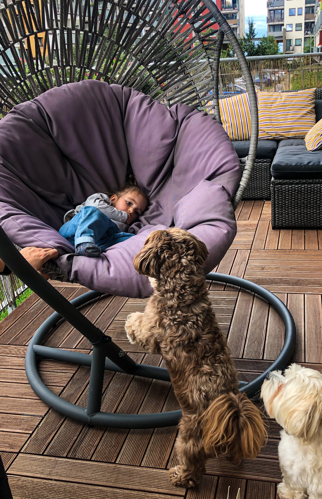 Nejmilejší návštěva si tentokrát zabrala houpací křeslo a potom celej balkon. Pejsci z toho byli značně překvapeni, ale nakonec se všichni skamarádili.