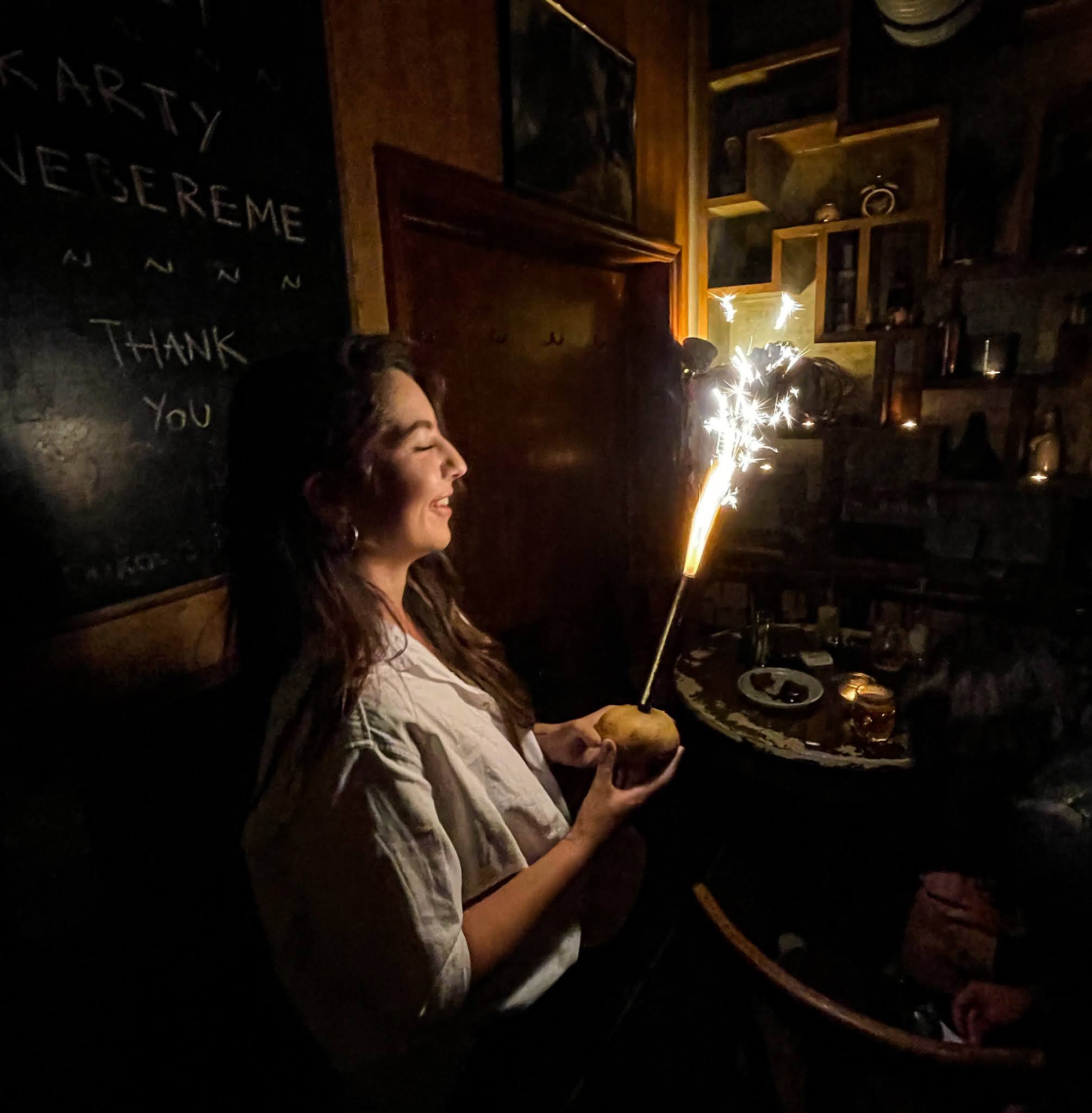 Měla jsem svátek a bylo zase skvělý překvapení. Během poklidného posezení v našem oblíbeném baru přede mnou najednou přistála brambora s prskavkou a udělala pořádnej rozruch, haha. Miluju tyhle nápady, překvápka a oslavy.