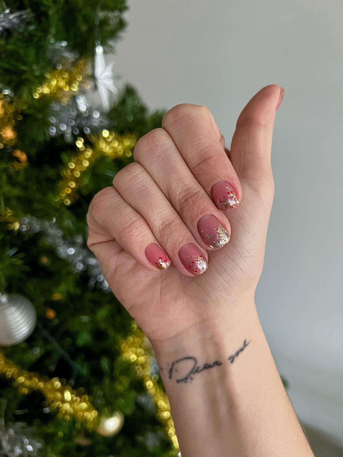 No a u vánočních nehtů – tam jsem málem skončila se sobem, protože jsem byla rozhodnutá pro nějakej vánoční kýč. Nakonec jsem si ale na poslední chvíli uvědomila, že by mě to asi rychle začalo štvát a že nechci hned po vánocích řešit nový nehty a tak jsem šla do svých oblíbených fólií stříbrný a zlatý a přidala k tomu červený tečky, aby to teda aspoň něco vánočního mělo. Jsem z nich nakonec fakt nadšená, vypadaj jako namrzlý mrazem a až budou odrůstat, nebude to extra moc vidět.