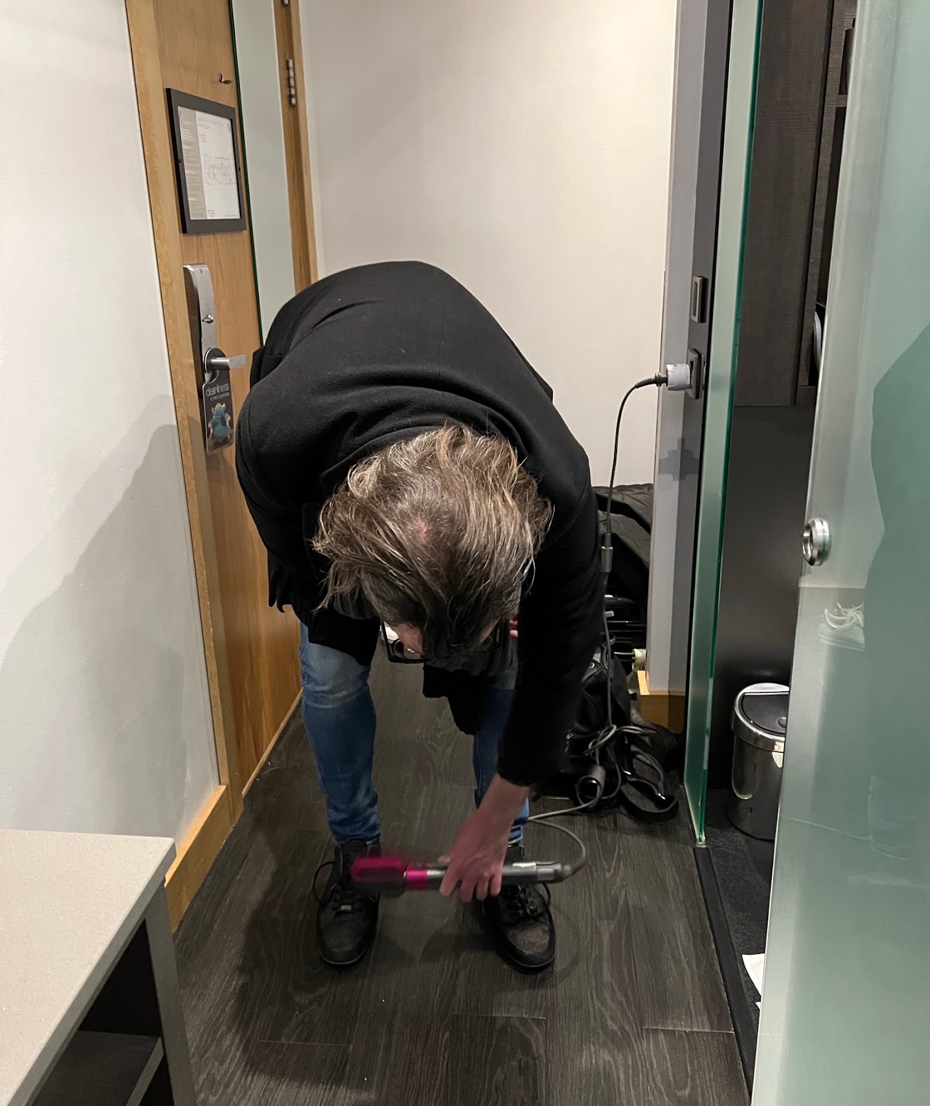 Celá velikost našeho pokoje (já fotím z postele) a ranní sušení bot. Díky bohu za můj super výkonnej Dyson. 😀