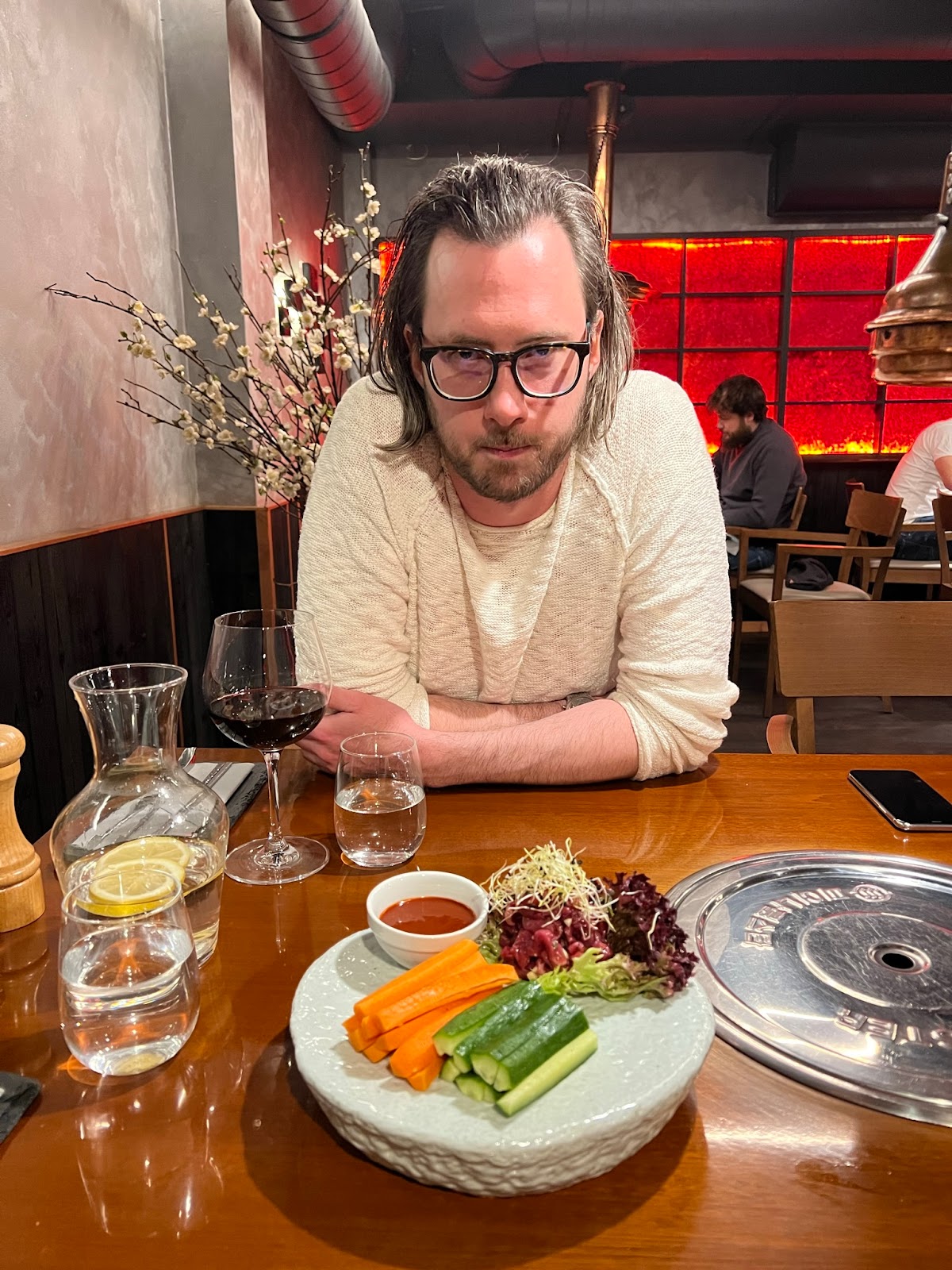 A s Jakubem k večeři korejský bbq, který mám spojený s oslavnejma momentama, ale nikdo tam se mnou moc nechce chodit, protože si “nechce grilovat jídlo sám, ale chce ho dostat hotový, když jde do restaurace.”
